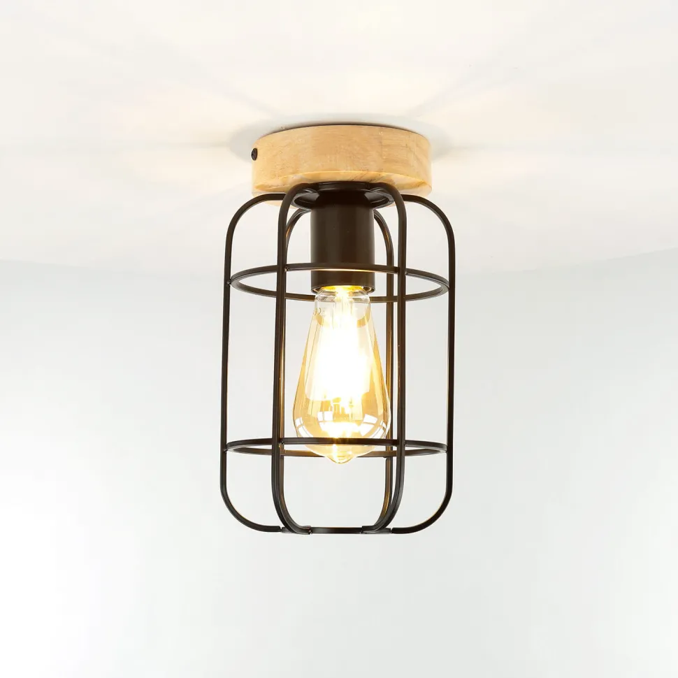 Kleine Deckenleuchte aus Metall und Holz im dekorativem Retro Design