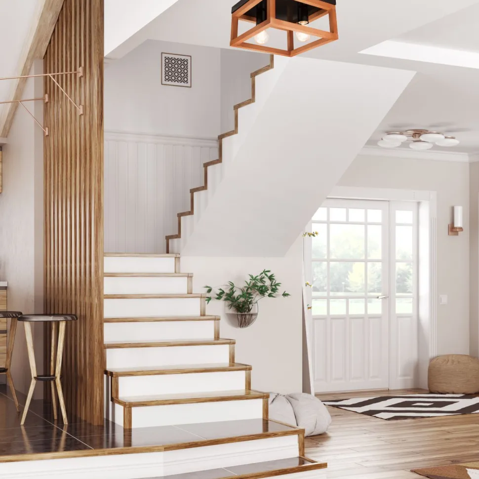 Eckige Deckenlampe aus Holz und Metall