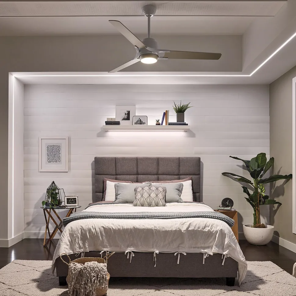 Der Ventilator verschafft Abkühlung an heißen Tagen und erlaubt als Deckenlampe eine großzügige Beleuchtung im Wohnzimmer, Schlafzimmer und Büro