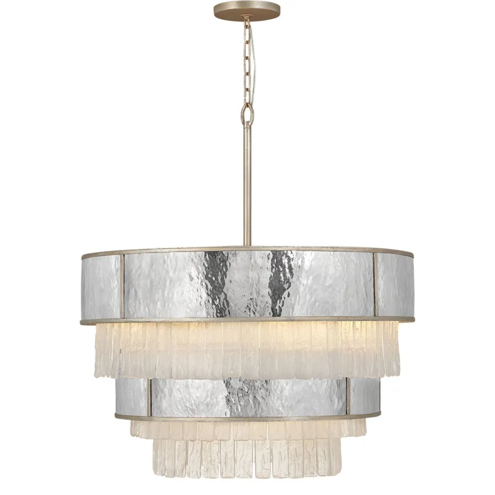 Der trichterförmige Schirm besticht durch seine Stufen, abwechselnd aus Kristall und Metall, was für ein außergewöhnliches Lichtspiel sorgt