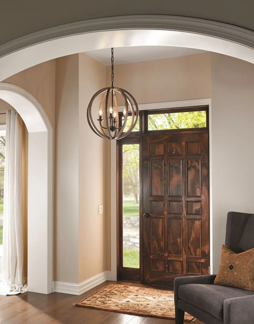 Ein dekoratives Highlight ist der runde Schirm aus Eiche, der durch seine verwitterte Optik jedem Raum ein rustikales Ambiente verleiht