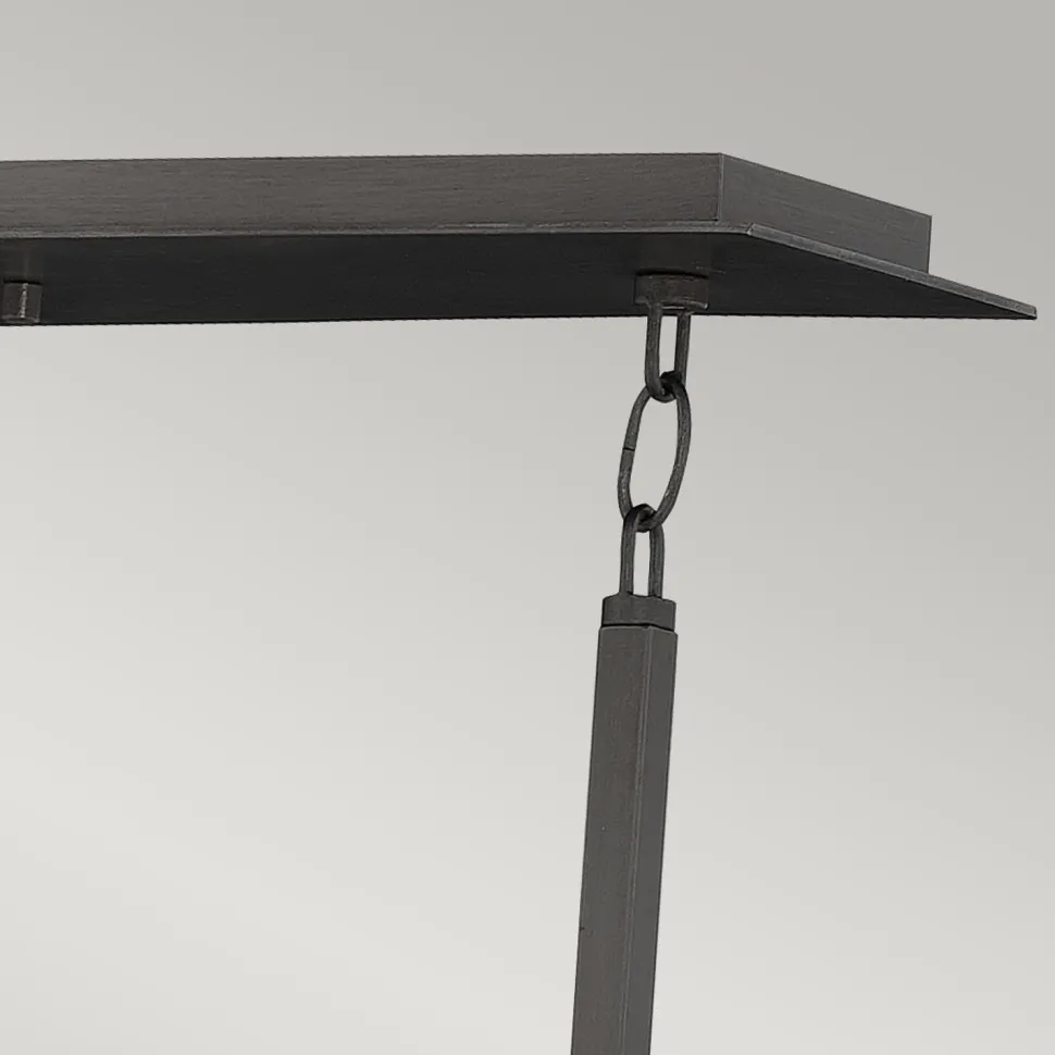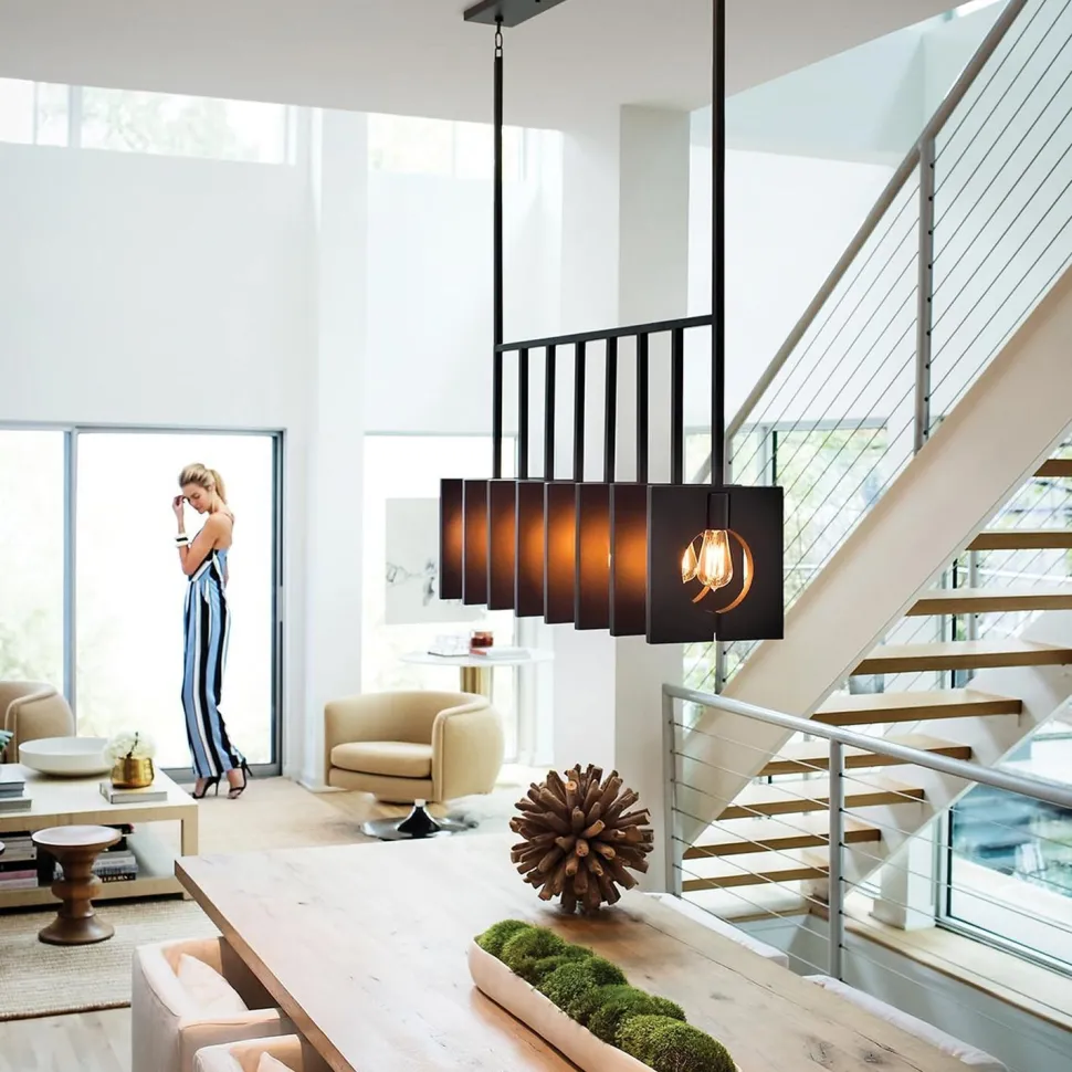 Die eckigen Rahmen in mattem Schwarz setzten einen spannenden Kontrast zur runden Licht-Öffnung, was aus der Hängelampe einen dekorativen Blickfang in Wohnzimmer und Flur macht