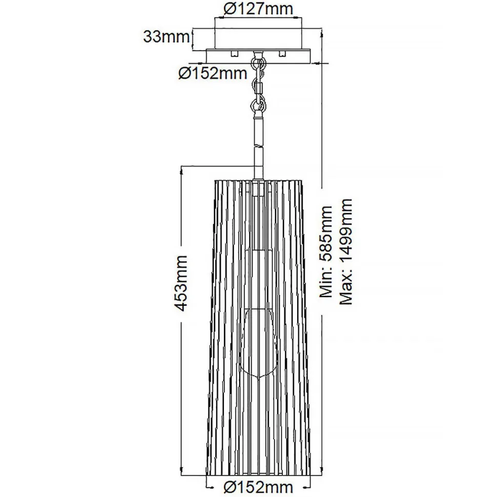 | Maße: | Breite: 152 mm | Hängetiefe: 585-1499 mm | Länge: 152 mm | Durchmesser: 152 mm | Höhe Schirm: 453 mm |