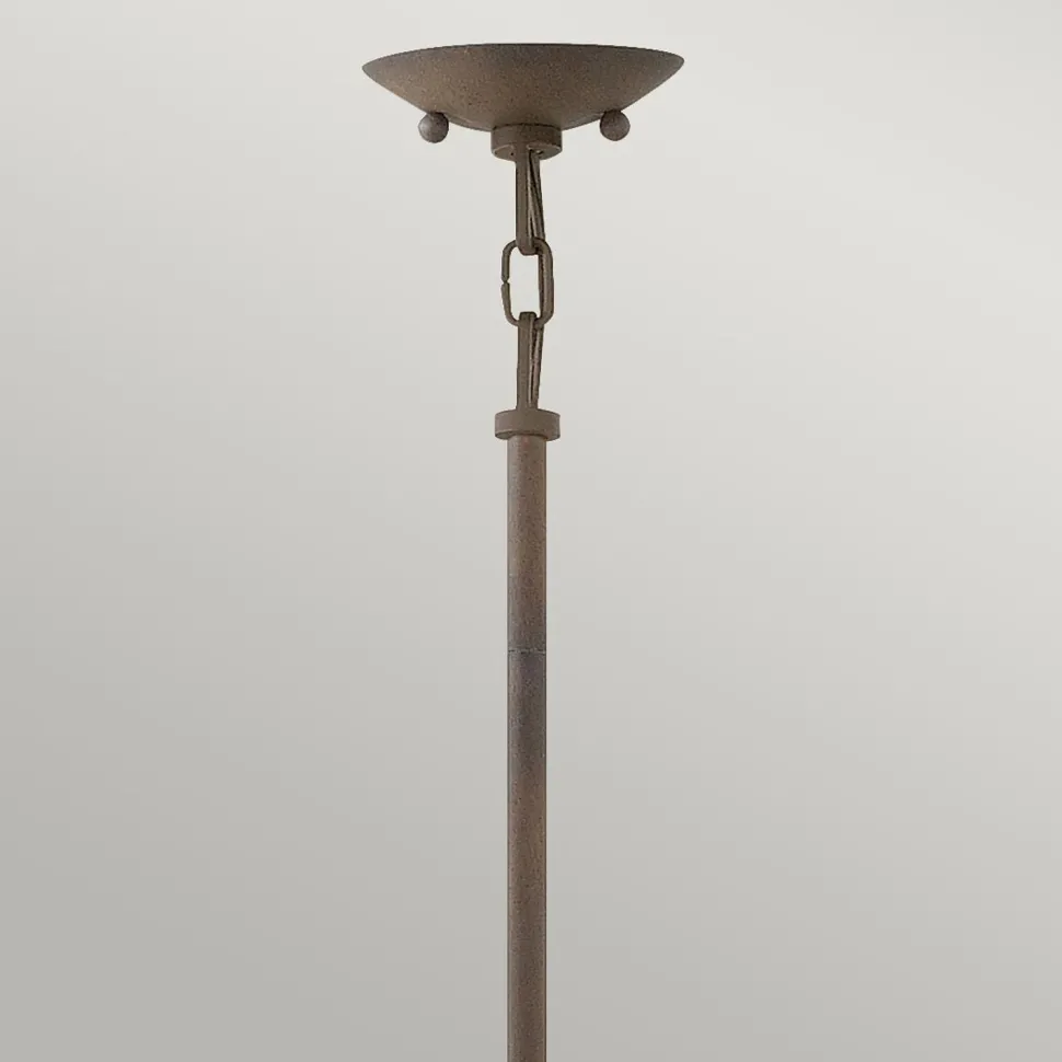 Der Kugelschirm in antiker Eisenoptik umrahmt den inneren Glasschirm und macht die Pendelleuchte zu einem absoluten Hingucker