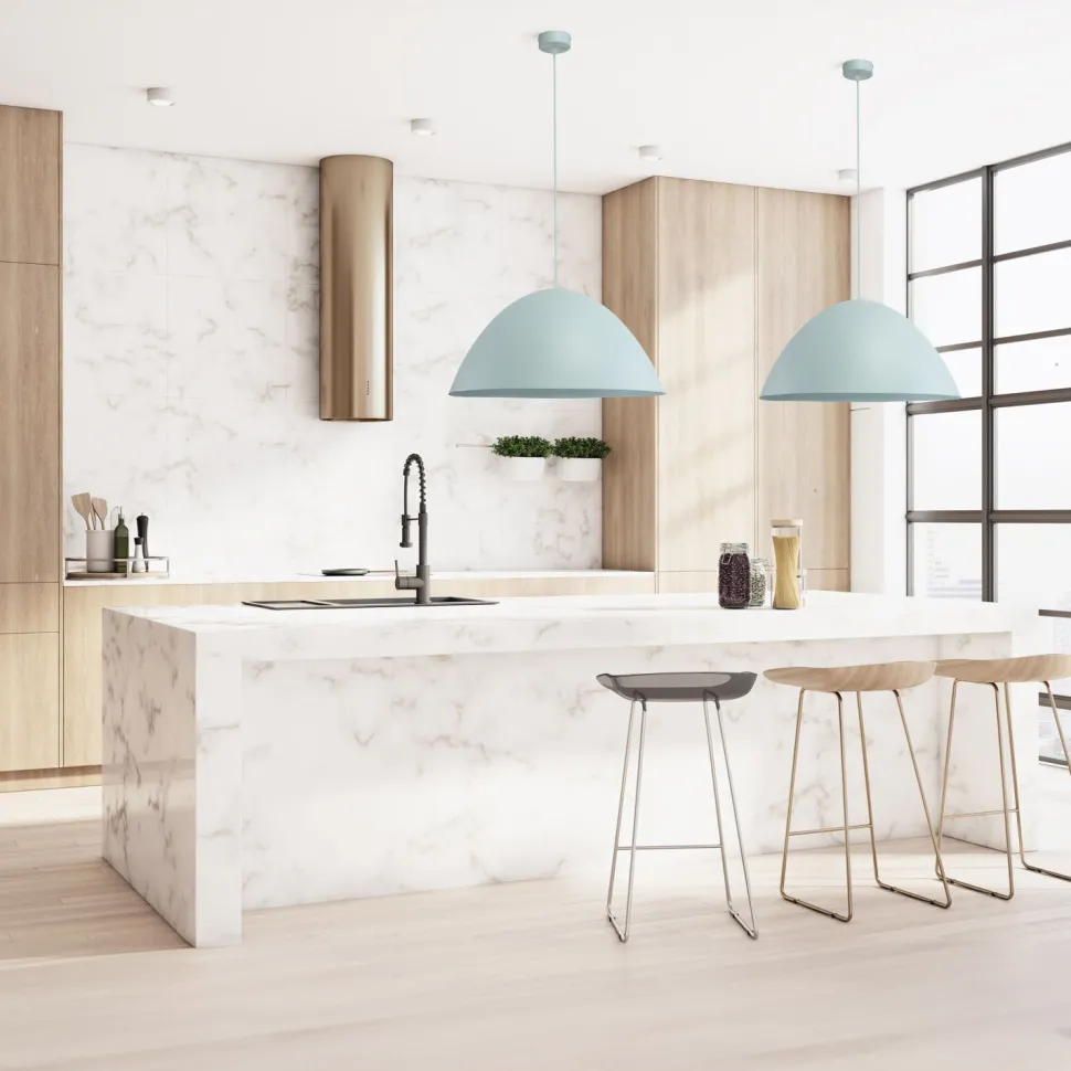 Der runde Schirm sorgt für eine zielgerichtete Beleuchtung nach unten – ideal über Esstisch, Kücheninsel und Tresen