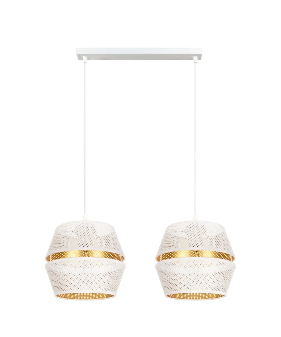 Qualität Made in EU Entdecke die Loft Pendelleuchte PATBOND – ein stilvolles Highlight für dein Zuhause! Mit ihrem eleganten Design aus weißem und goldfarbenem Metall zieht diese Hängelampe alle Blicke auf sich. Die einzigartigen Löcher in den Metallschirmen sorgen für ein faszinierendes Lichterlebnis, das jeden Raum in ein warmes, einladendes Ambiente taucht. Ob im Wohnzimmer, in der Küche oder über dem Esstisch – diese Pendelleuchte ist die perfekte Wahl für alle, die Wert auf Qualität und Design legen. Mit einer Länge von 900 mm und einer Höhe von 500 mm eignet sich die PATBOND ideal für hohe Decken und bietet eine großzügige Hängetiefe. Die Lampe ist für den Innengebrauch (IP20) konzipiert und wird mit 230V betrieben. Sie benötigt zwei E27 Leuchtmittel mit einer maximalen Leistung von 60W, die dir die Freiheit geben, die Lichtstimmung nach deinen Wünschen zu gestalten. Die selbsttragende Kabelaufhängung sorgt für eine einfache Installation und eine sichere Befestigung. Die PATBOND Pendelleuchte ist nicht nur ein Blickfang, sondern auch eine funktionale Lösung für dein Zuhause. Sie vereint modernes skandinavisches Design mit praktischen Eigenschaften und ist somit die ideale Wahl für designbewusste Käufer, die gleichzeitig auf Qualität und Preis-Leistung achten. Lass dich von der Kombination aus Metall und Gold inspirieren und verwandle dein Zuhause in einen stilvollen Rückzugsort. Fazit: Die Loft Pendelleuchte PATBOND ist mehr als nur eine Lampe – sie ist ein Statement. Hol dir dieses außergewöhnliche Lichtobjekt und erlebe, wie es deinen Wohnraum aufwertet!