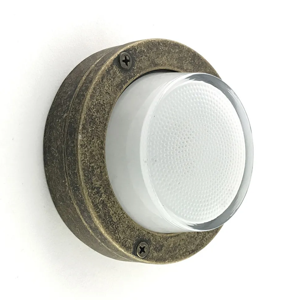 Runde Außenwandleuchte aus massivem Messing und satiniertem Glas in verwittertem Messing und Weiß: ideal als Haustür Lampe, Terrassenlampe, Balkon Lampe, Carport Beleuchtung und Garagenlampe