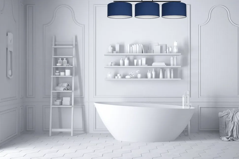 Die blauen Stoffschirme sind dekorativ und streuen das Licht diffus und blendarm in den Raum