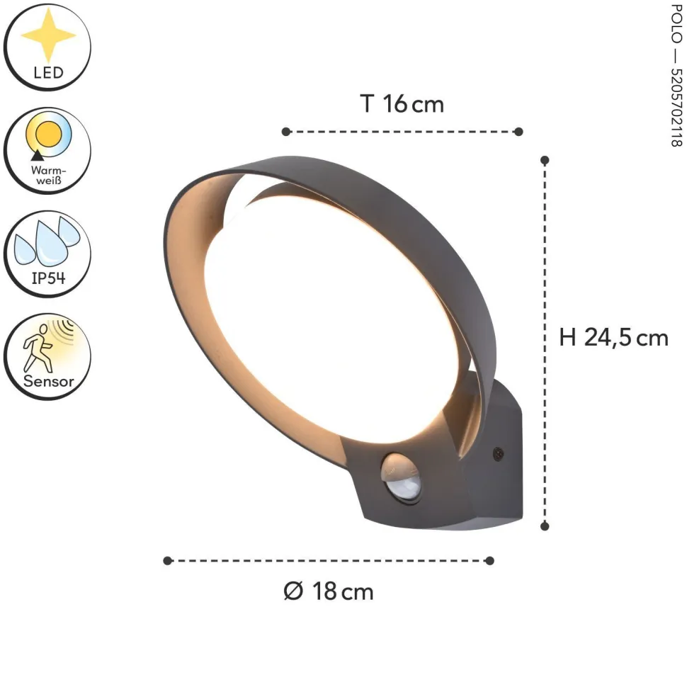 Moderne LED Wandleuchte mit Bewegungsmelder in Anthrazit
