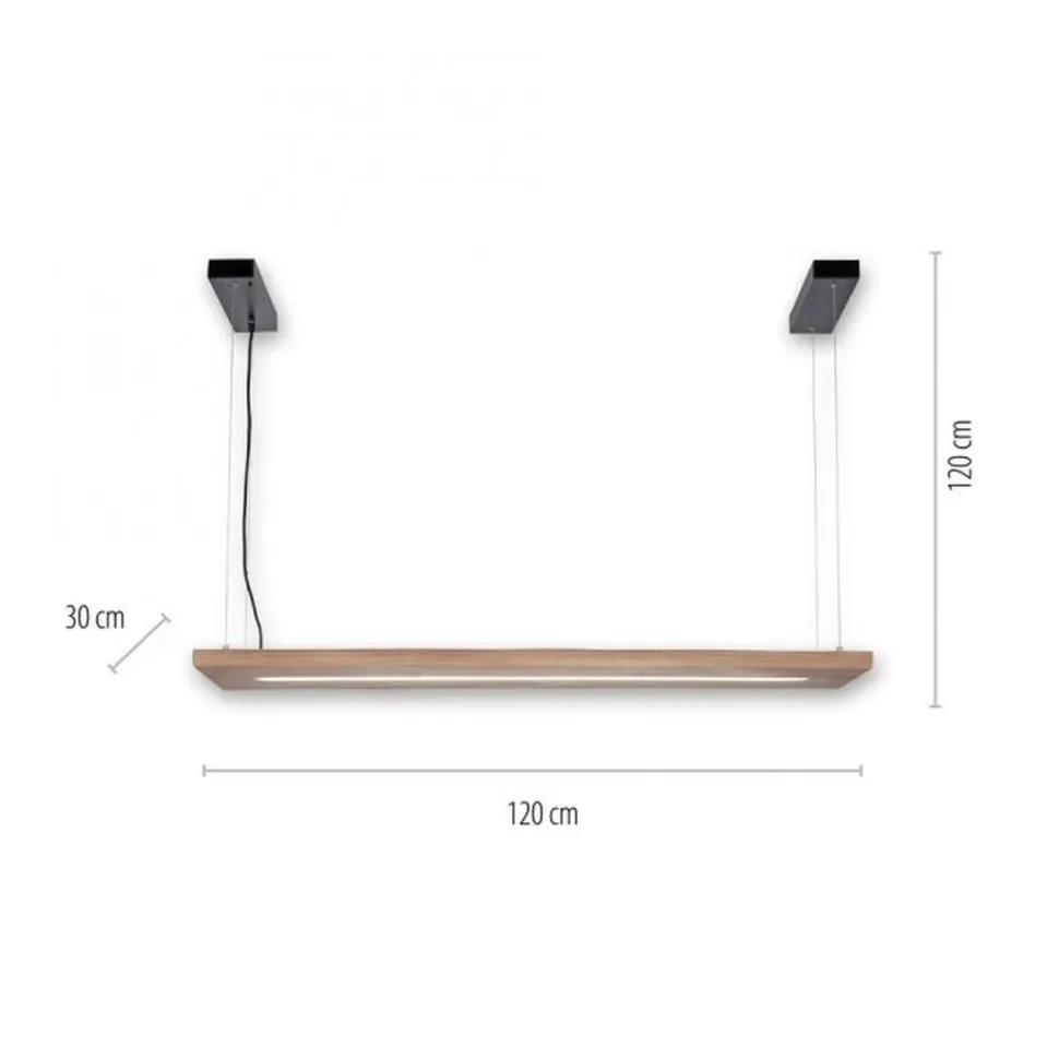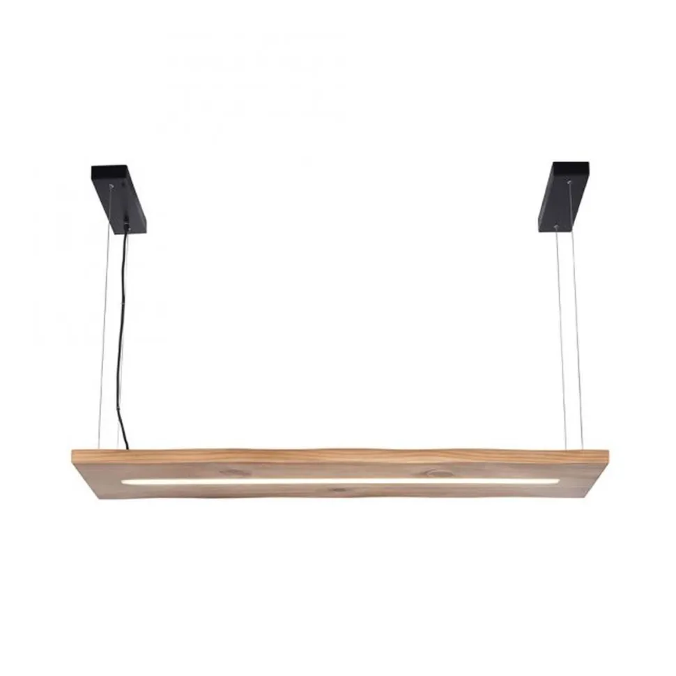 Das große Holzelement sorgt für einen wohnlichen und natürlichen Akzent Zuhause – ideal als längliche Pendelleuchte über dem Esstisch in Wohnzimmer und Esszimmer