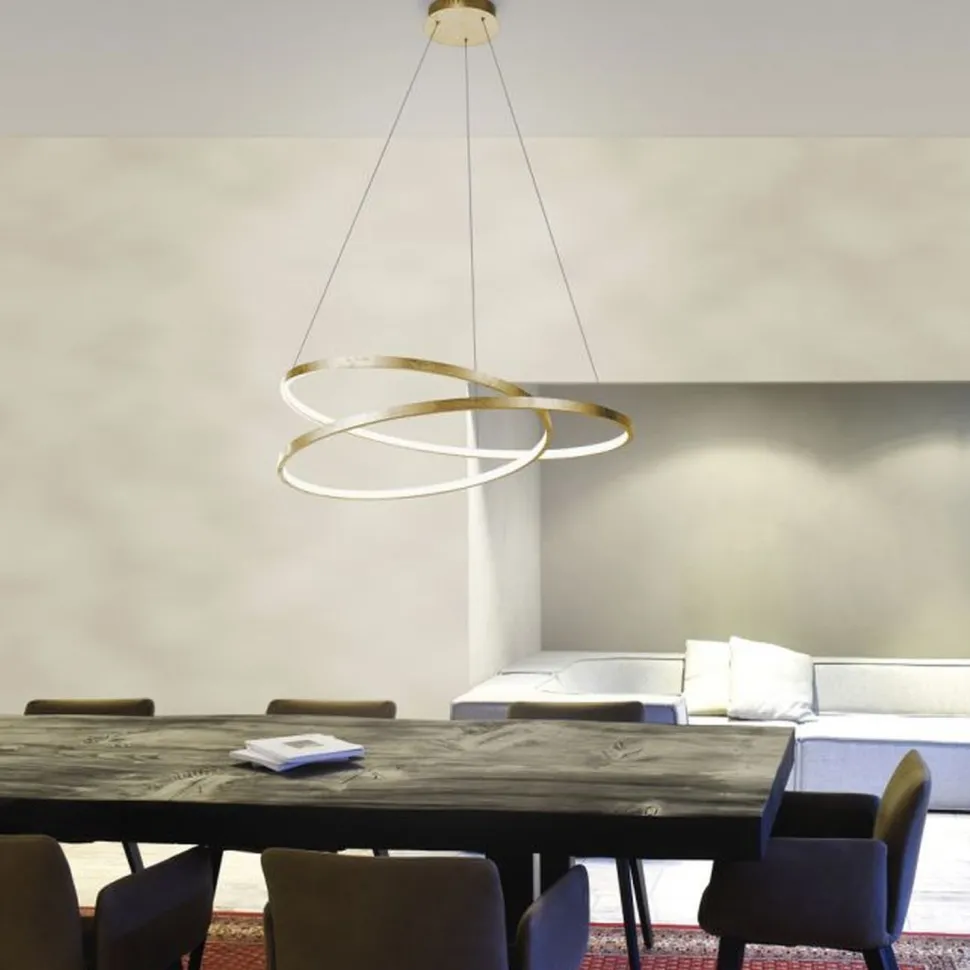 Die eleganten Leuchtringe der Pendelleuchte sorgen für ein einzigartiges Lichtspiel – perfekt über dem Esstisch in Wohnzimmer, Esszimmer und Küche