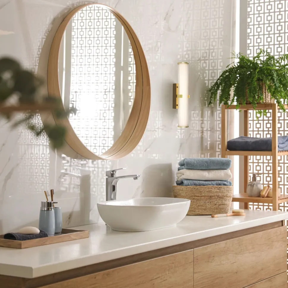 Das Licht wird durch den satinierten Glasschirm blendarm gestreut und sorgt für eine angenehme Beleuchtung – ideal neben dem Spiegel