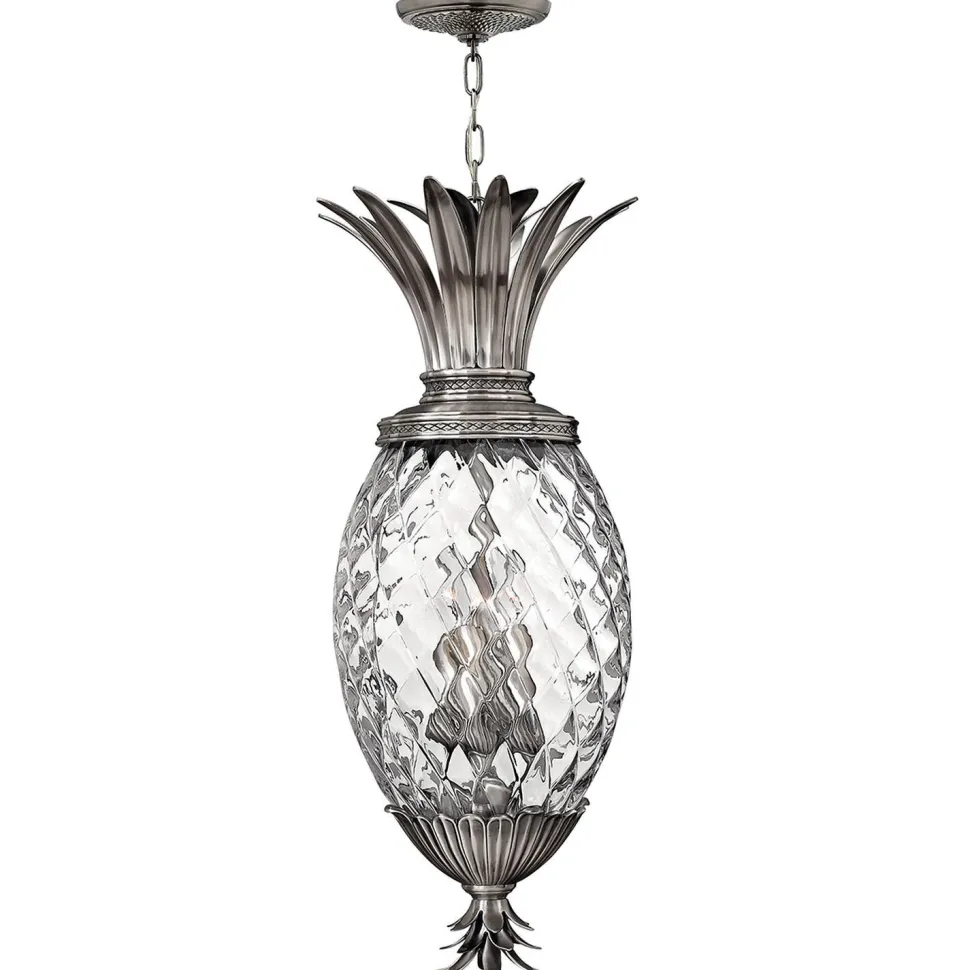 Eine Ananas aus geschliffenem Glas dient als Lampenschirm macht aus der Pendelleuchte ein dekoratives Meisterwerk