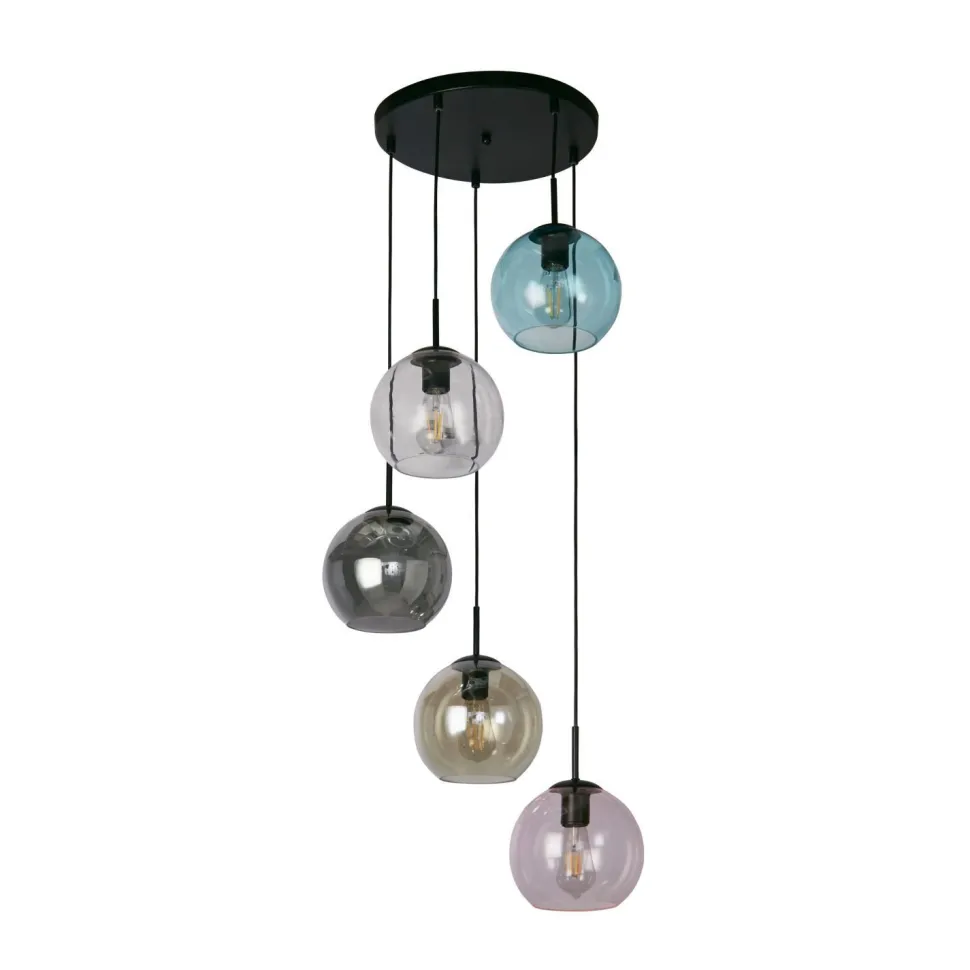 Farbenfrohe Pendelleuchte mit Kugelschirmen aus Glas
