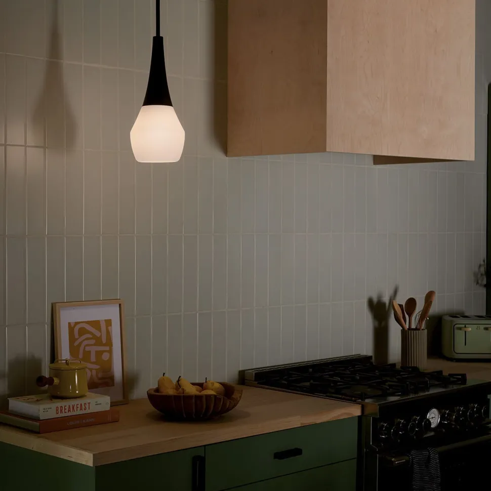 Die bauchige Pendelleuchte sorgt für eine blendarme Lichtstreuung und fügt sich ideal in Küche, Esszimmer und Wohnzimmer ein