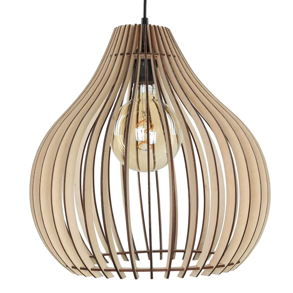 Das Holz des Lampenschirms ist in einem wohnlichen Farbton gehalten und fügt sich ideal in jede Einrichtung ein
