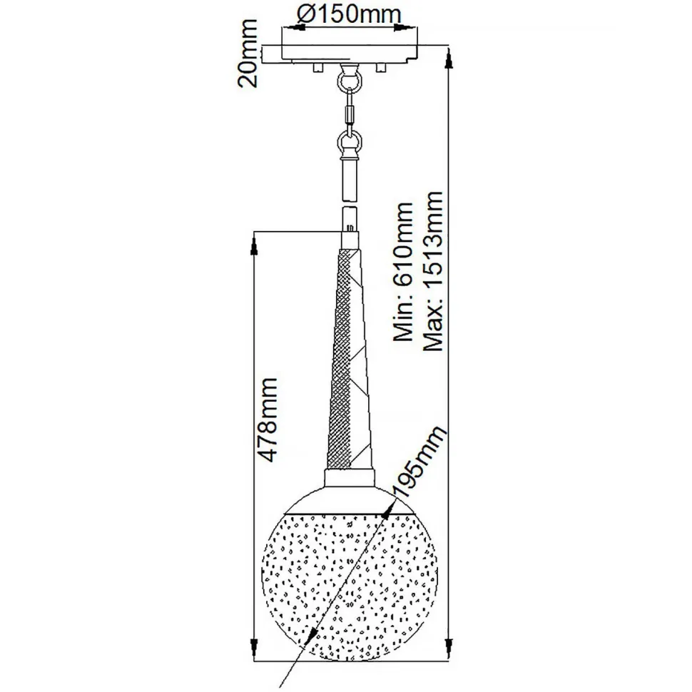 | Maße: | Breite: 195 mm | Hängetiefe: 610-1513 mm | Länge: 195 mm | Durchmesser: 195 mm | Höhe Schirm: 478 mm |