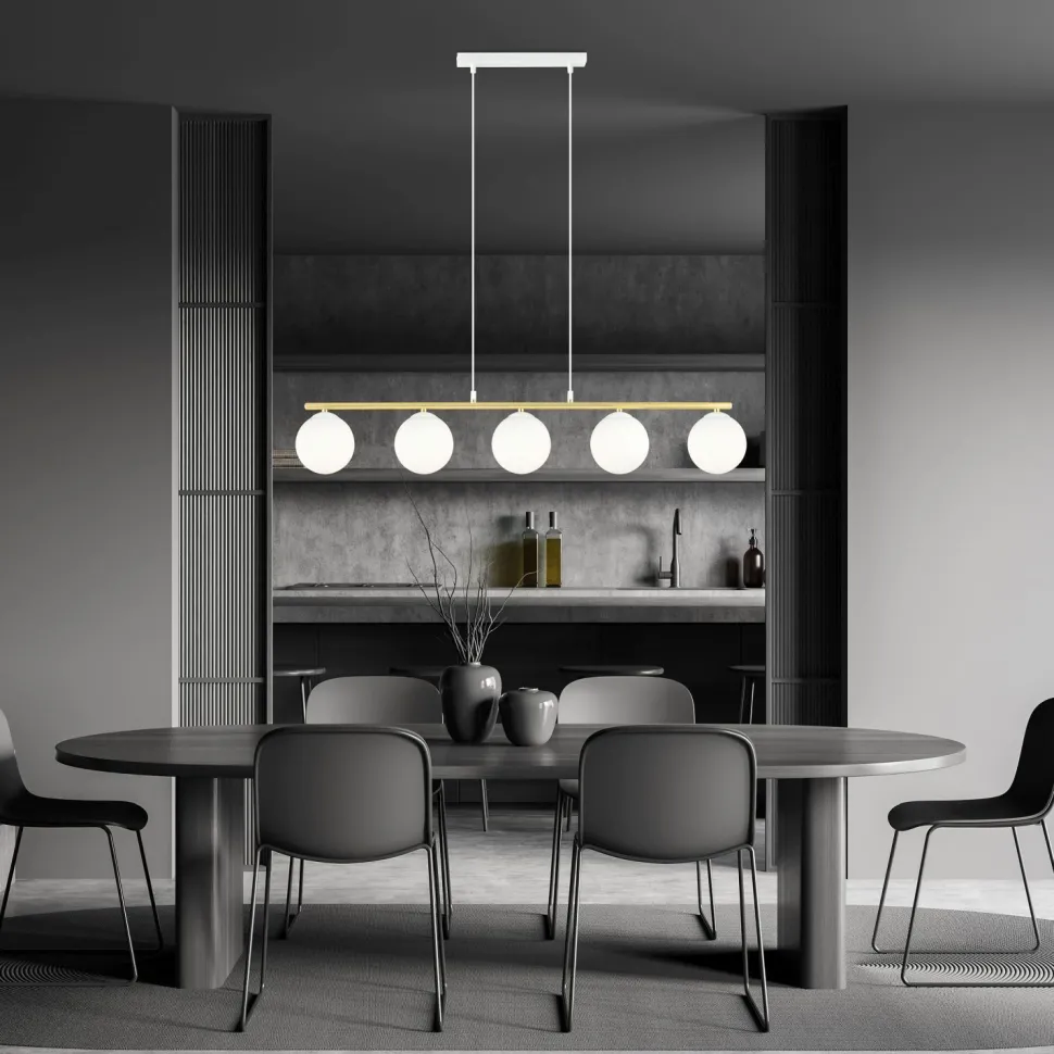 Die längliche Hängeleuchte sorgt für eine blendarme Beleuchtung und passt ideal über den Esstisch