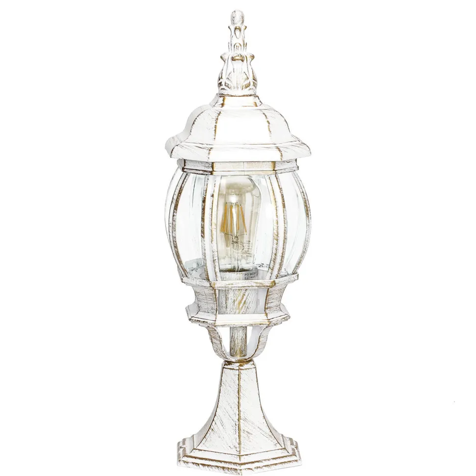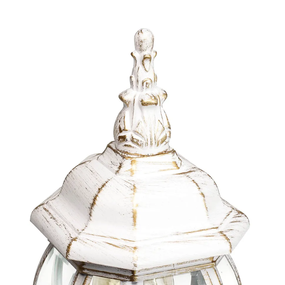 Die rustikale Sockelleuchte in Weiß Gold besteht aus witterungsbeständigem Aluminium und robustem Glas