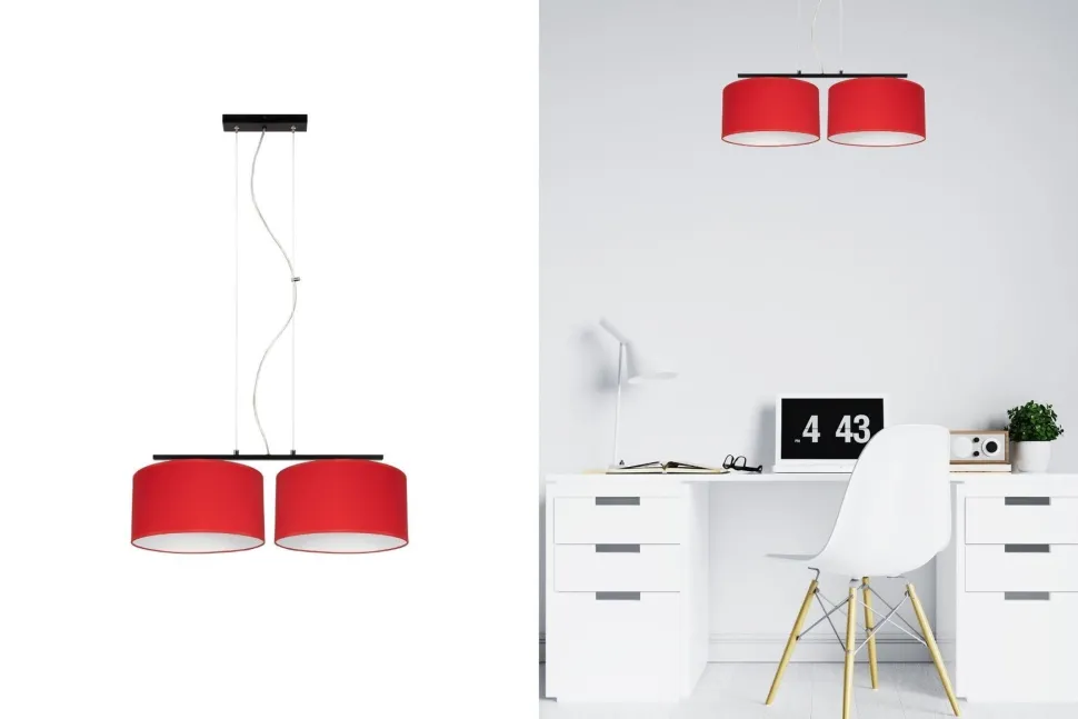 Die roten Stoffschirme sind dekorativ und streuen das Licht diffus und blendarm in den Raum