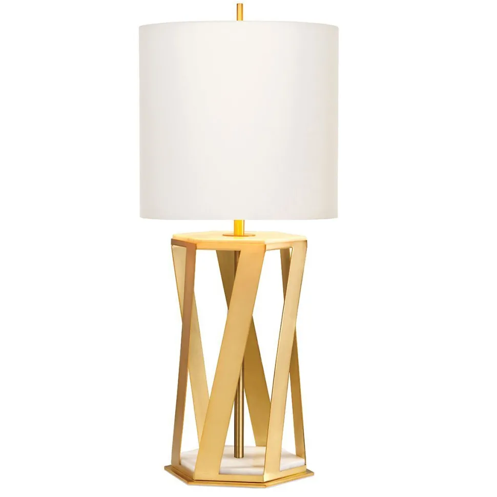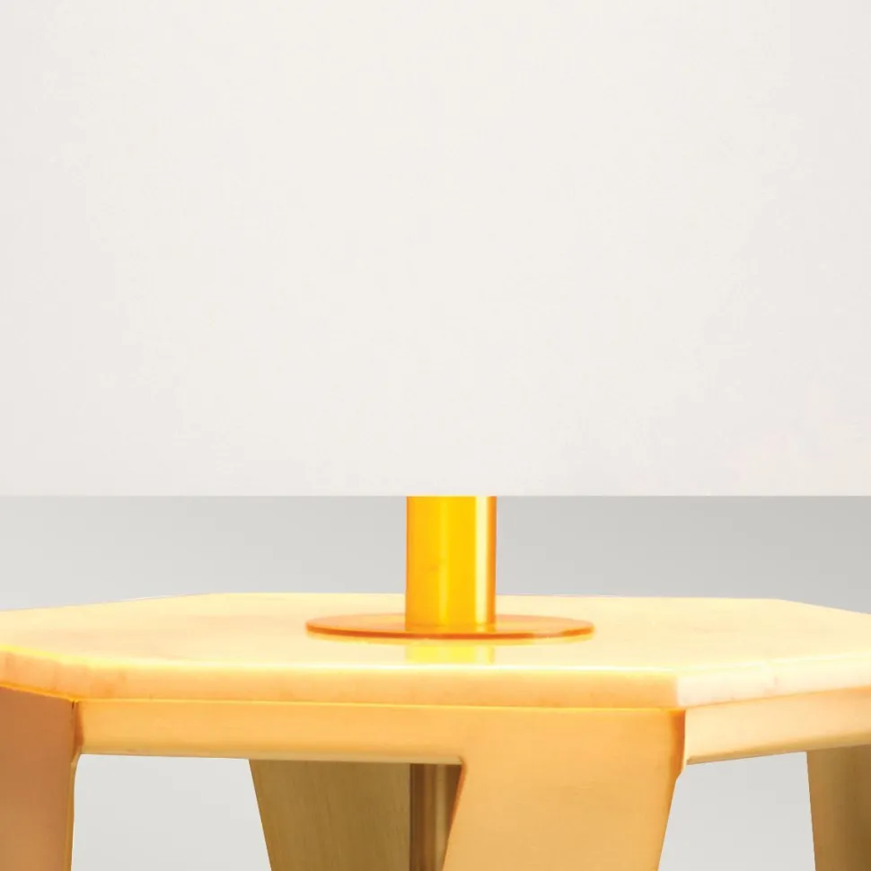 Der 6-eckige Körper in Gold ist offen gestaltet und gibt den Blick auf den edlen Marmorfuß preis