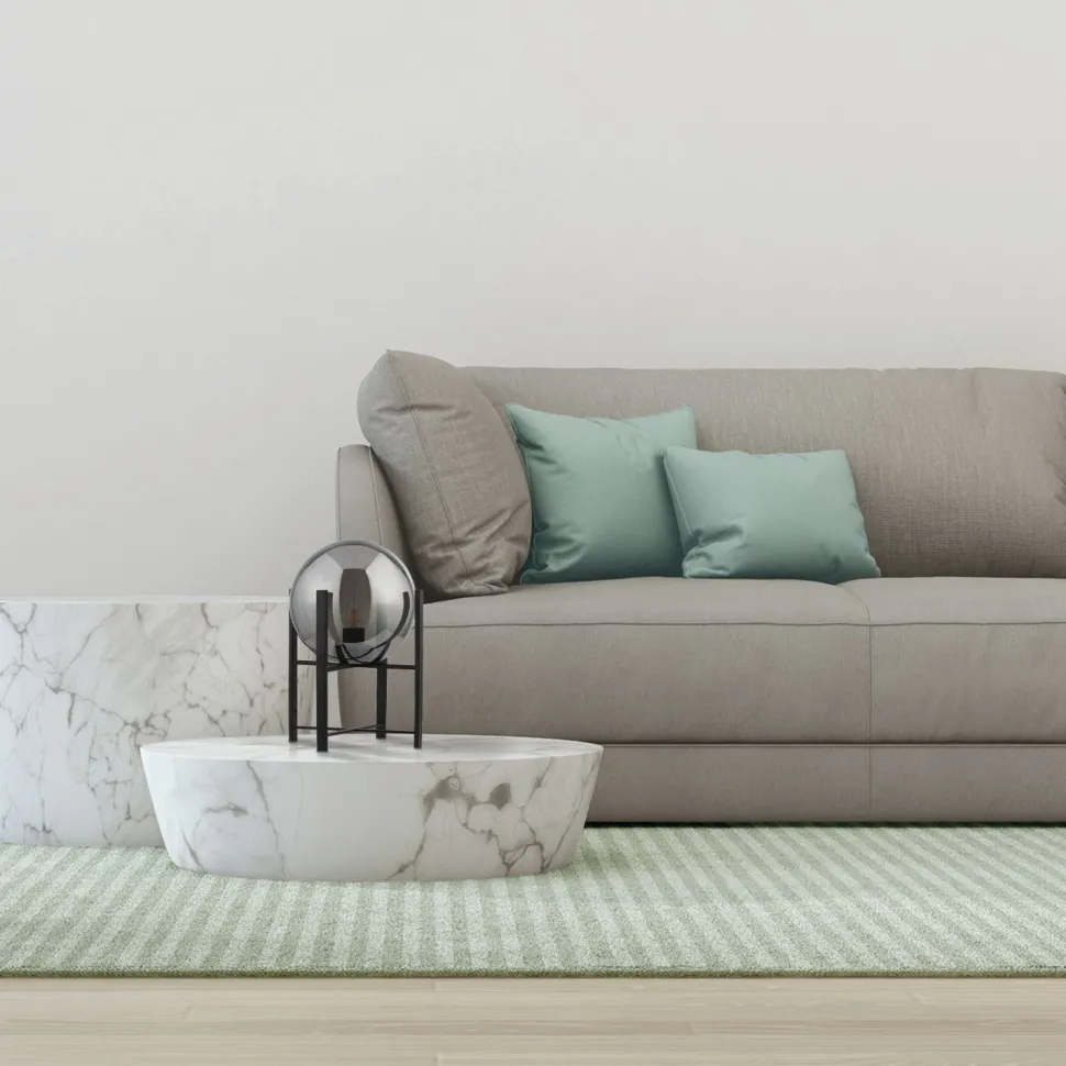 Das Rauchglas verleiht dem Kugelschirm einen besonderen Look, was aus der Tischlampe einen absoluten Blickfang macht