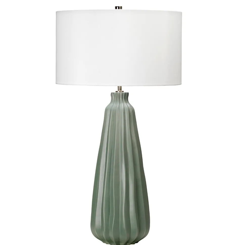 Große Keramik Tischleuchte in zartem Salbeigrün mit hellem Stoff Schirm