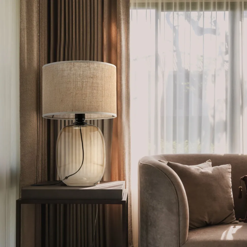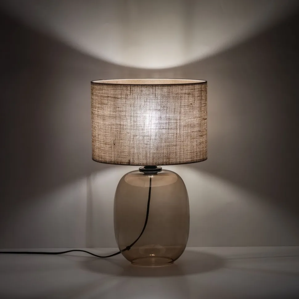 Wohnliche Tischleuchte mit Glasfuß und Stoffschirm