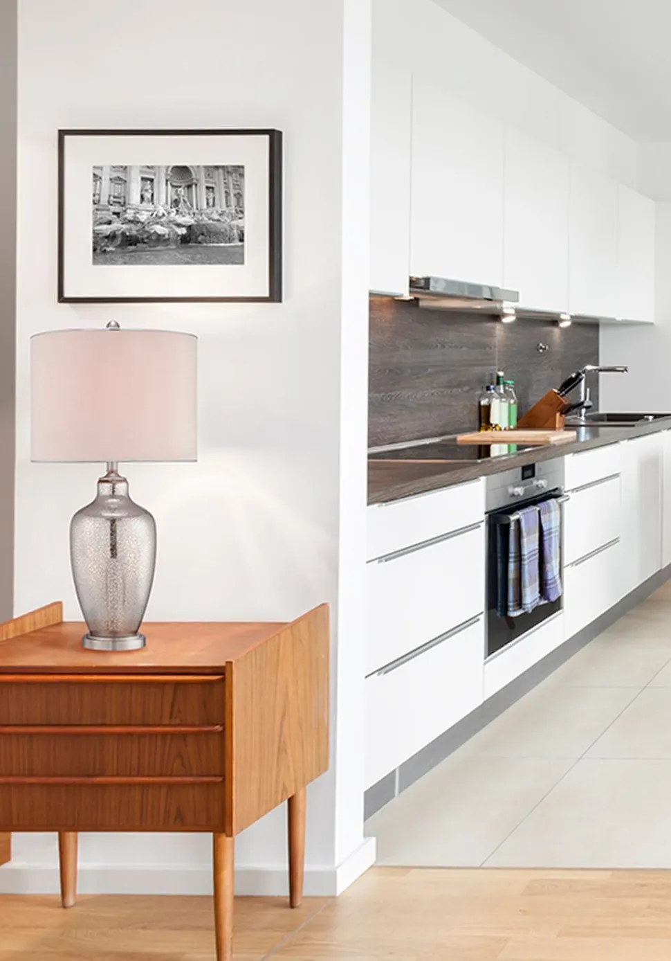 Der Korpus aus Quecksilber Glas besticht durch seinen einzigartigen Farbeffekt, was die Tischleuchte zu einem dekorativen Highlight in jedem Raum macht