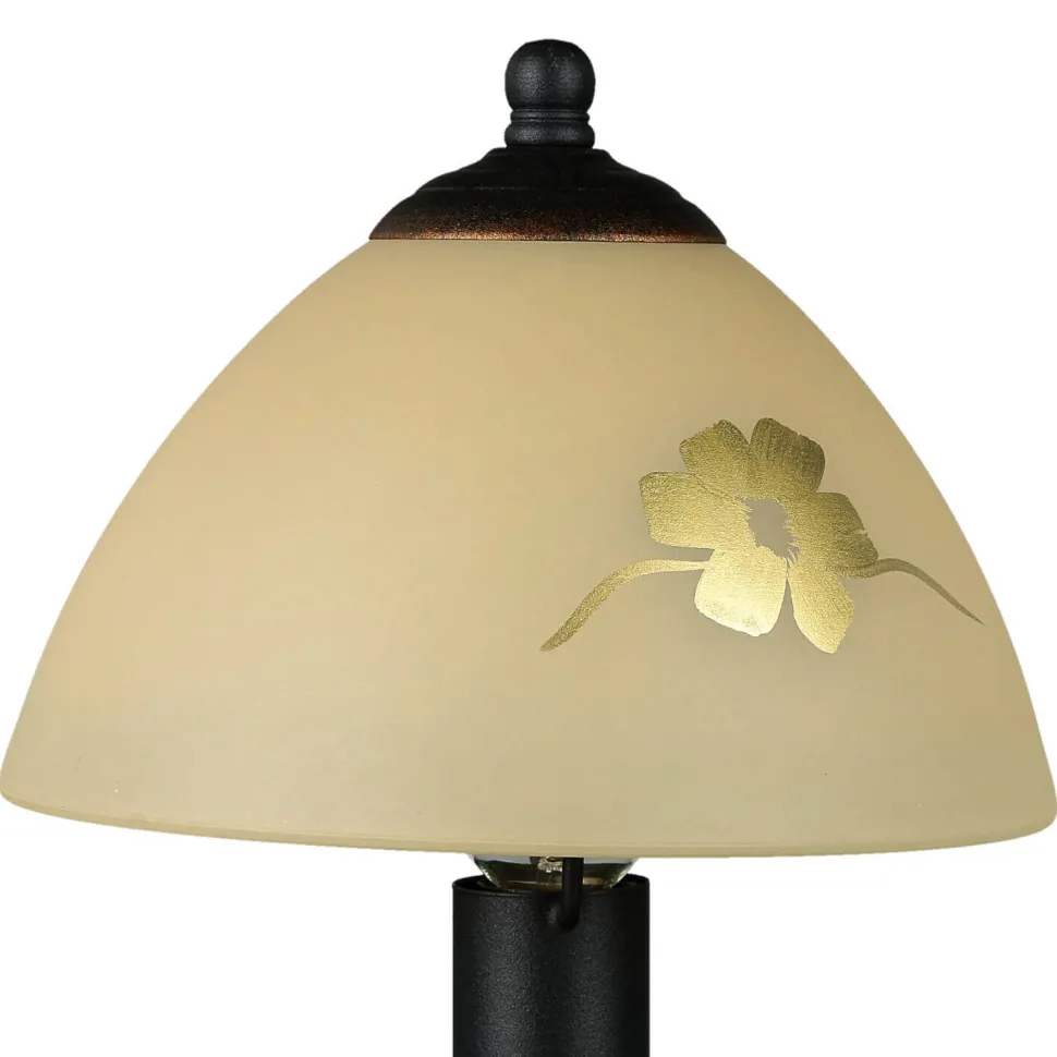 Der eingefärbte Glasschirm ist mit einem dezenten Blumenmuster veredelt, was den urigen Charakter weiter betont