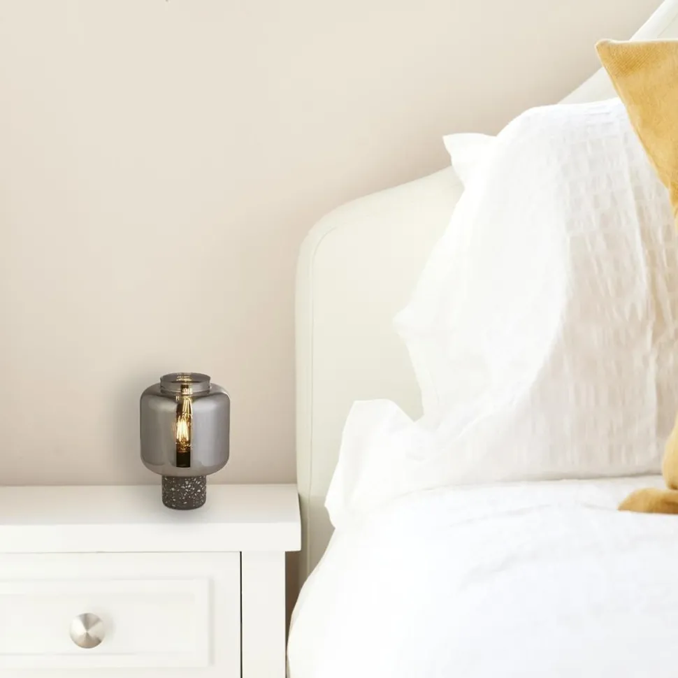 Der dunkle Beton Fuß in Kombination mit dem spiegelnden Rauchglas sorgt für einen edlen Look, der aus der Tischleuchte einen dekorativen Blickfang in Schlafzimmer und Wohnzimmer