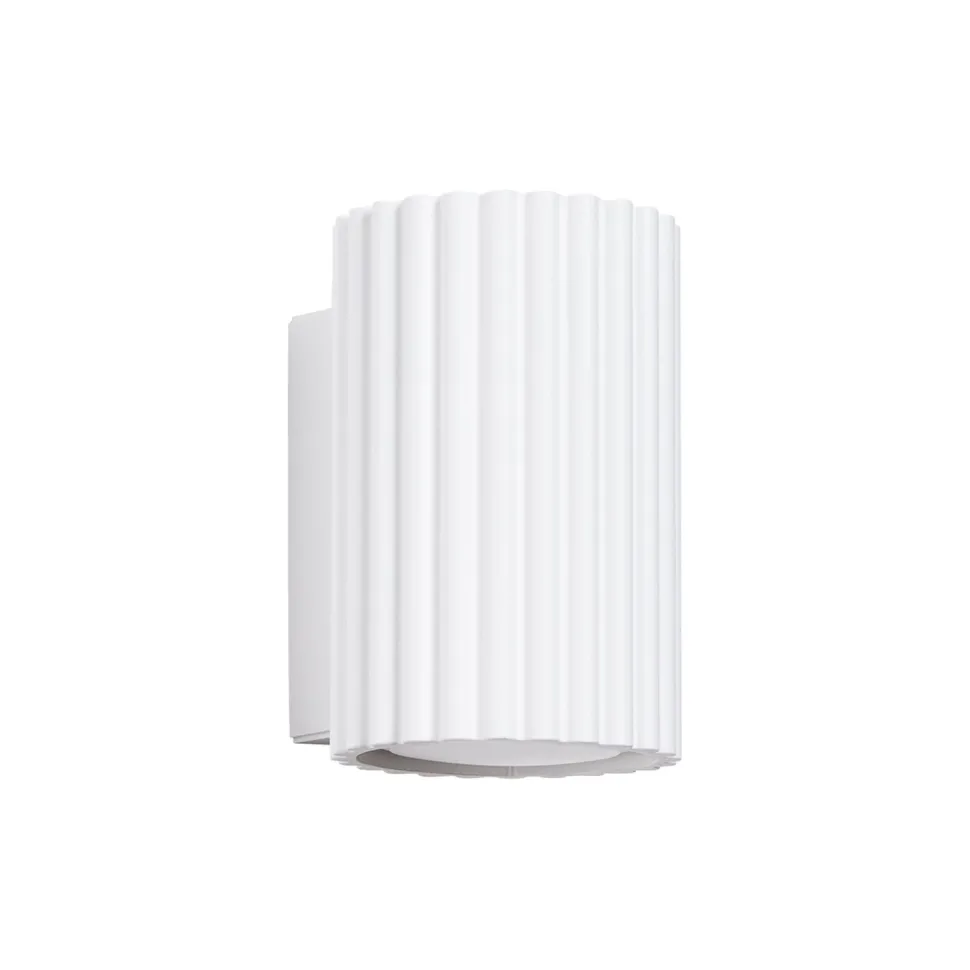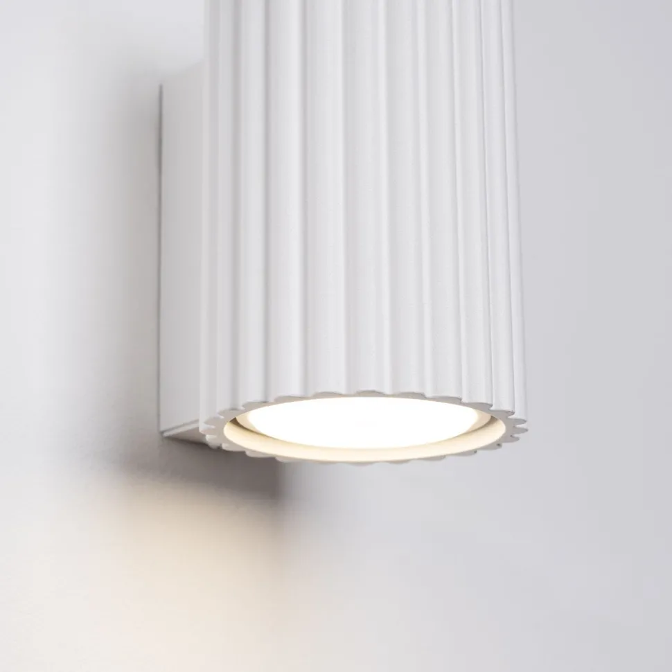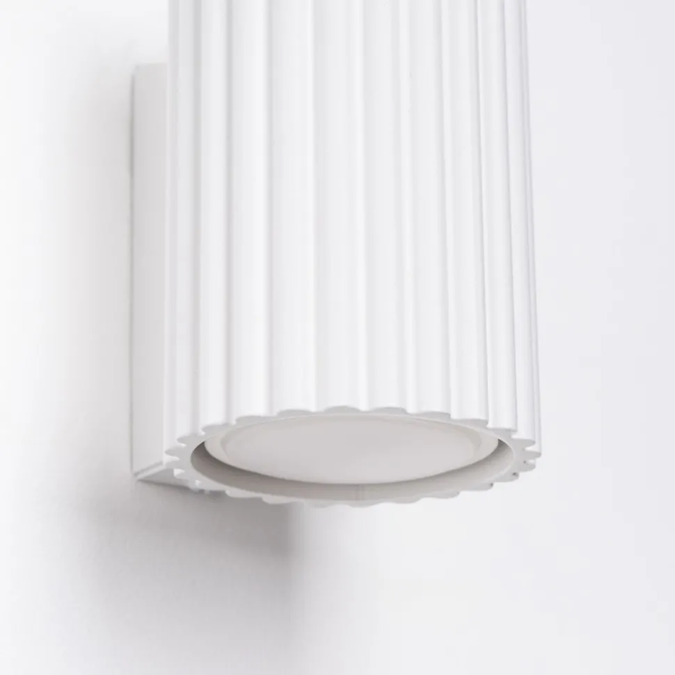 Kompakte Wandlampe aus Aluminium mit besonderem Lampenschirm in dezentem Weiß