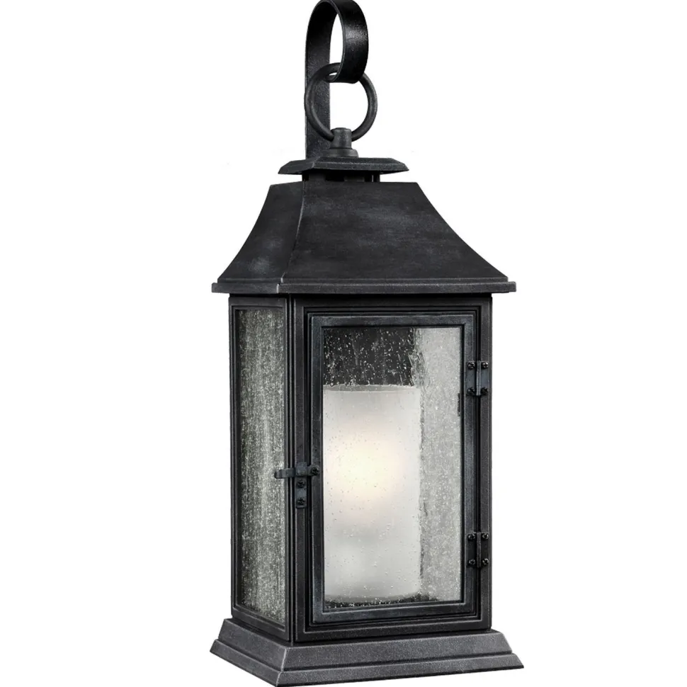 Die Laterne wurde in einem dunklen Zink in verwitterter Optik gehalten und setzt an jedem Eingang, Balkon und jeder Fassade dekorative Akzente