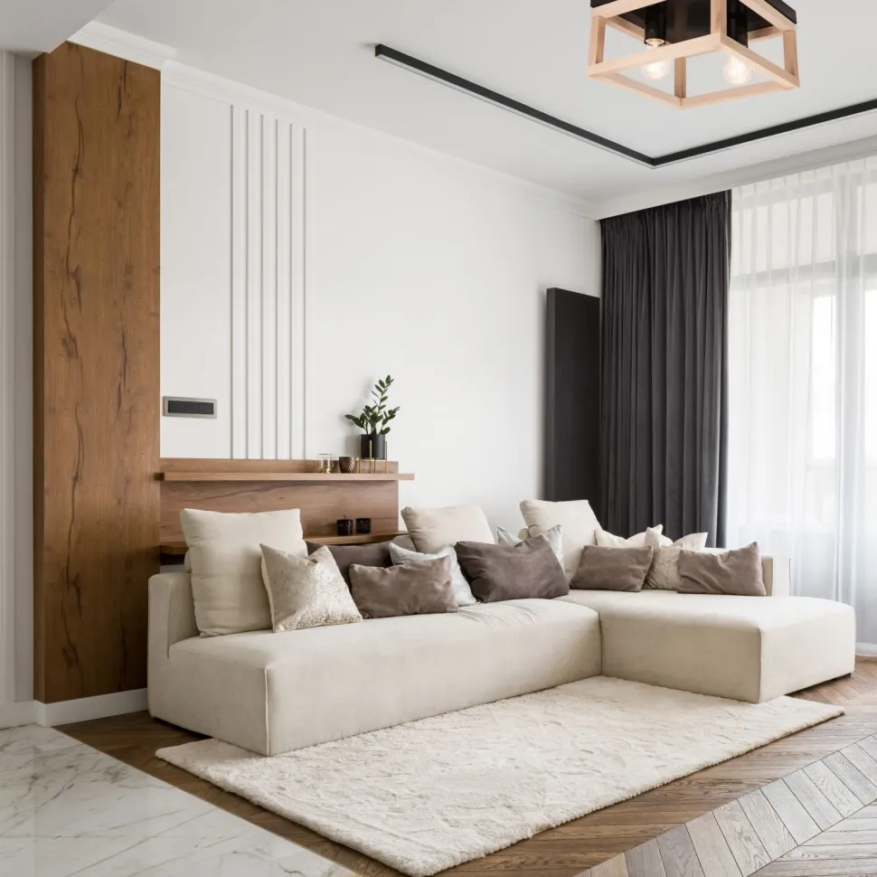 Die Kombination der Materialien sorgt für einen wohnlichen Look, wodurch die Deckenleuchte in jedem Raum zu einem echten Blickfang wird