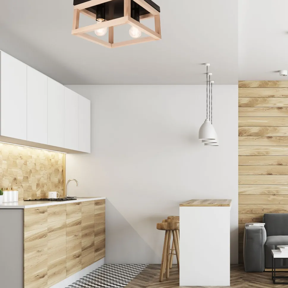 Eckige Deckenlampe aus Holz und Metall