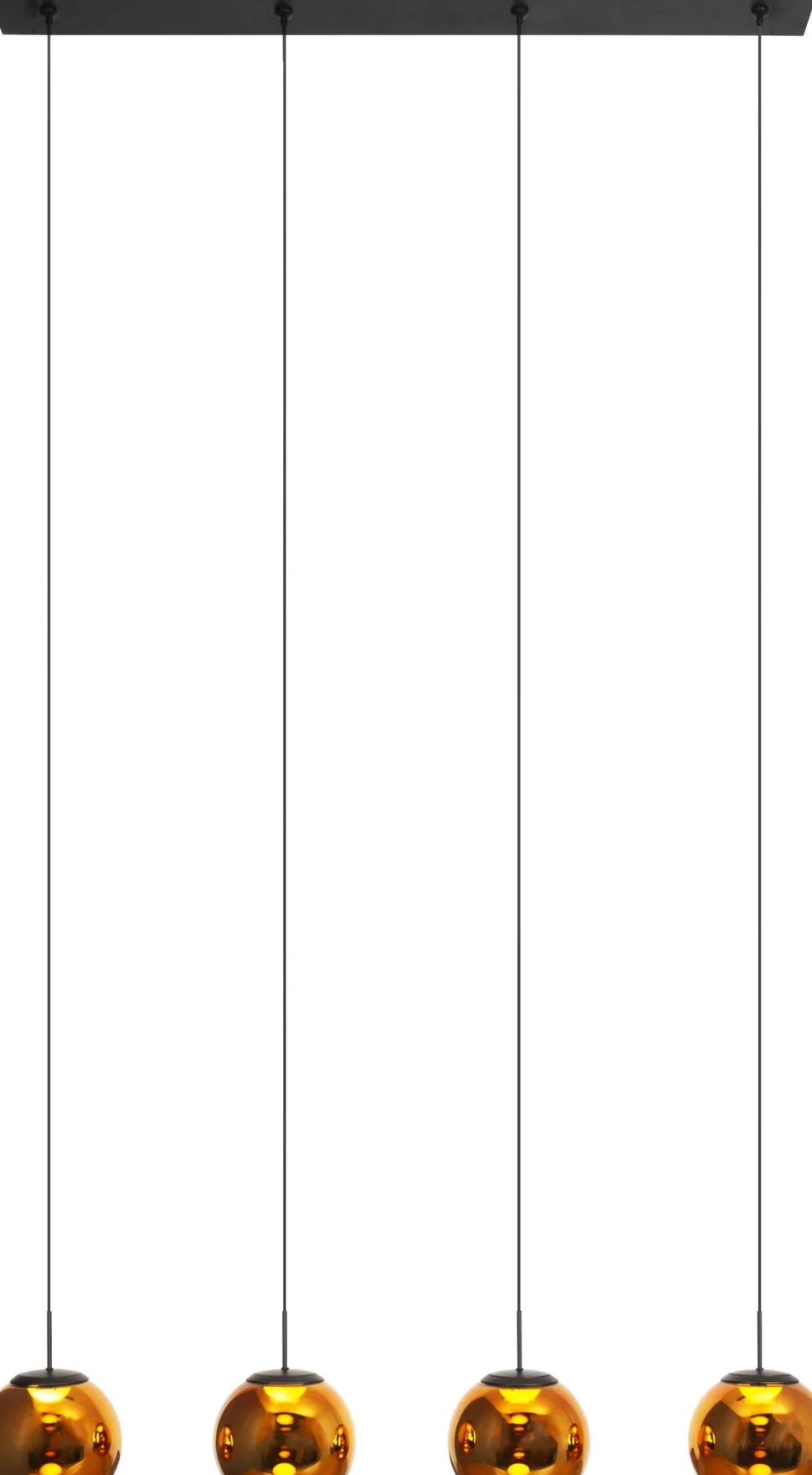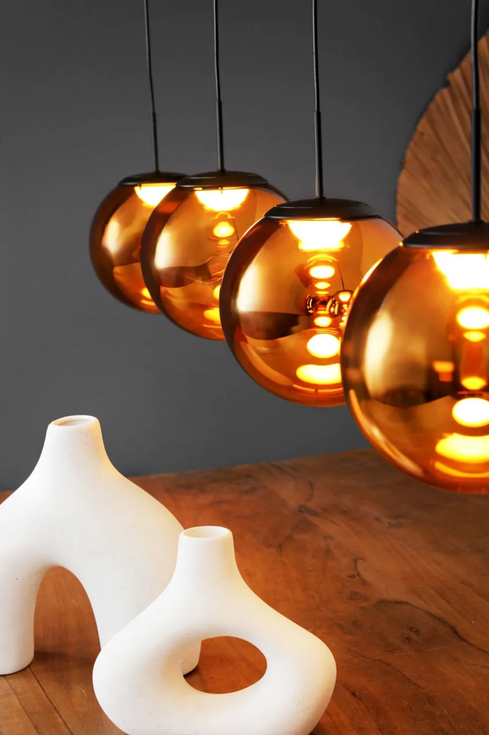 Die glänzenden Glasschirme in Bernstein bringen einen eleganten Touch in Dein Zuhause – perfekte Pendelleuchte über dem Esstisch in Esszimmer und Küche