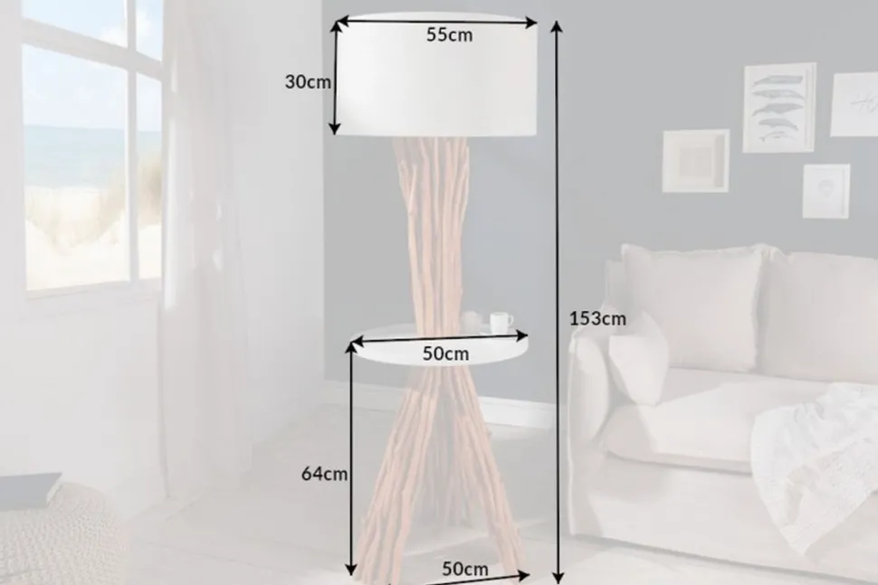 Natürliche Stehleuchte aus Massivholz und Leinen in Natur und Weiß