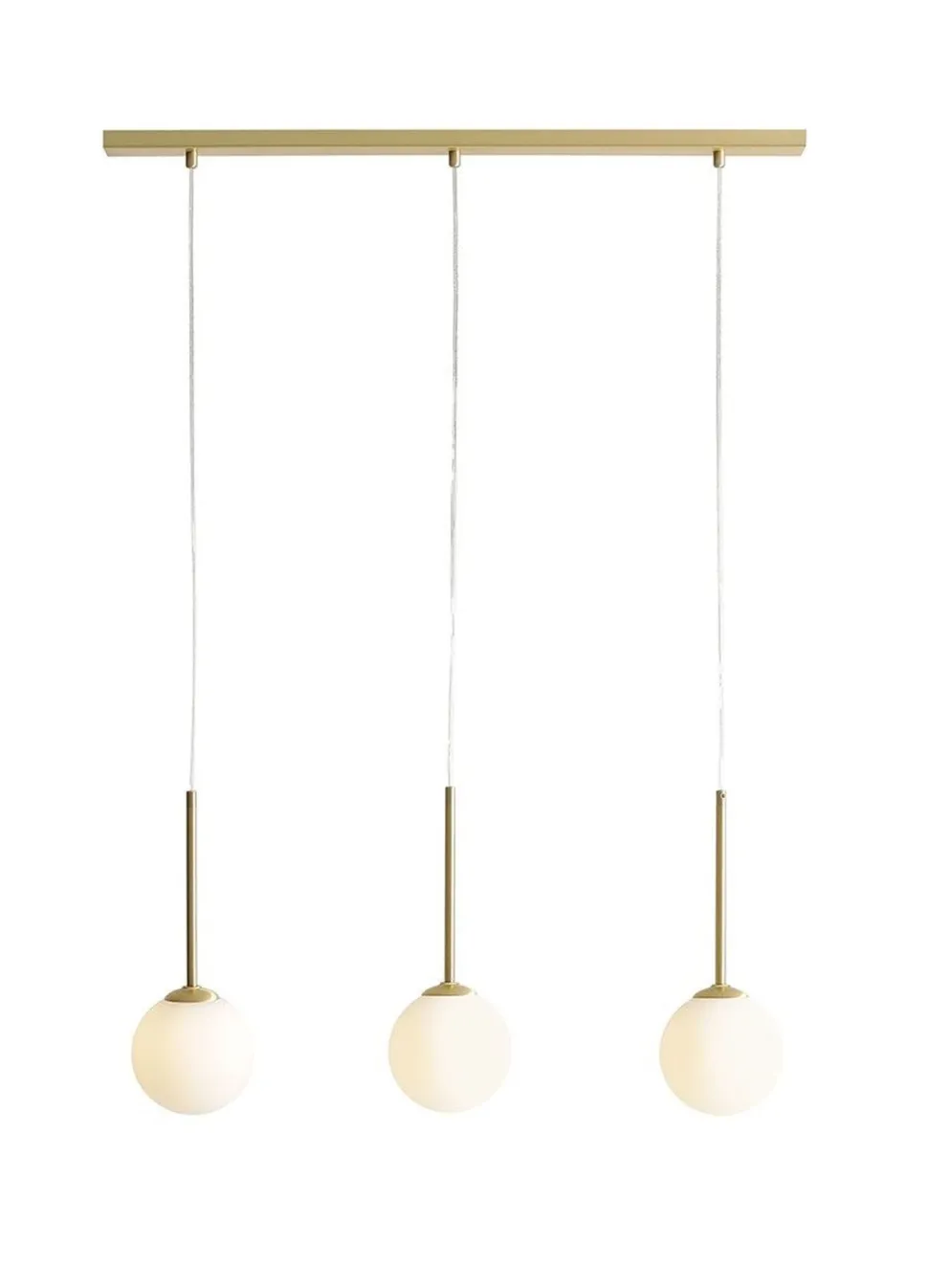 Die satinierten Kugelschirme aus Glas streuen das Licht warm und weich – ideal für ein gemütliches Ambiente über dem Esstisch in Wohnzimmer und Esszimmer