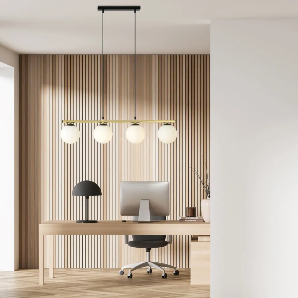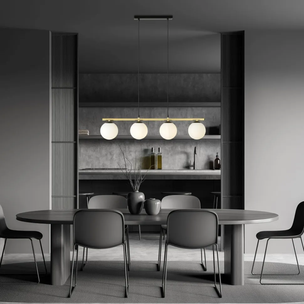 Die längliche Hängeleuchte sorgt für eine blendarme Beleuchtung und passt ideal über den Esstisch