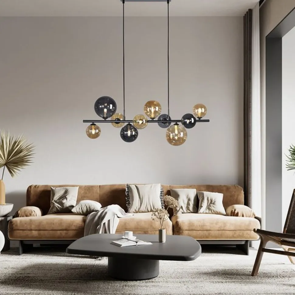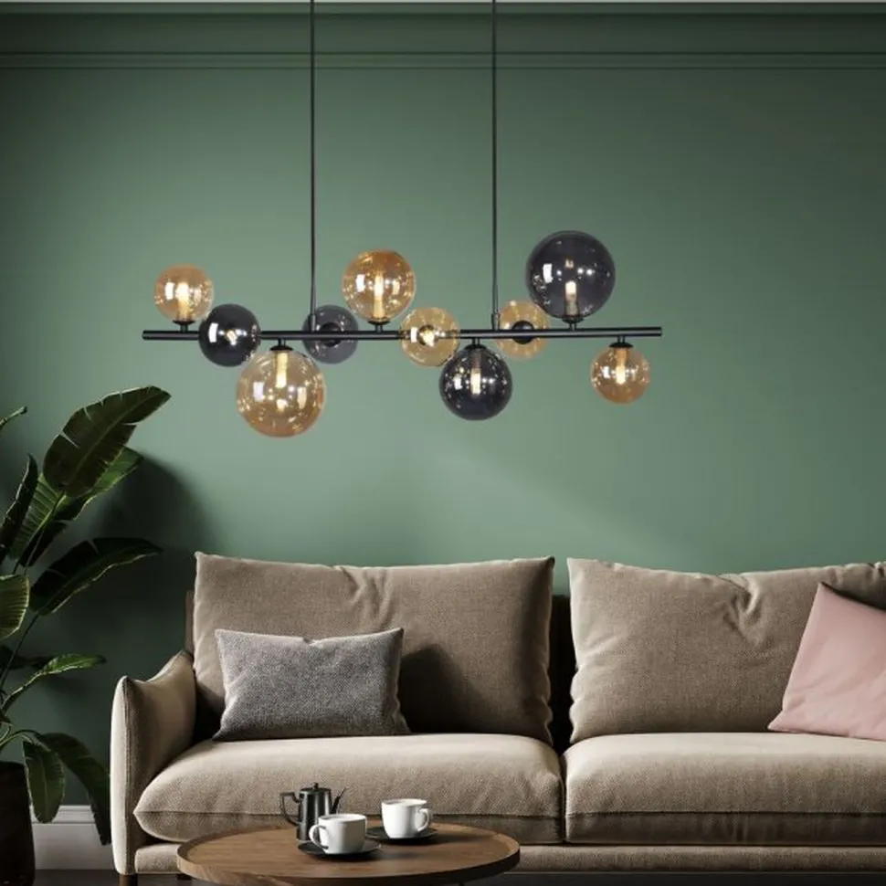 Die dekorativen Schirme aus Glas in Bernstein und Rauchgrau sind stilvoll und bringen blendarmes Licht in Dein Wohnzimmer und Esszimmer über dem Esstisch