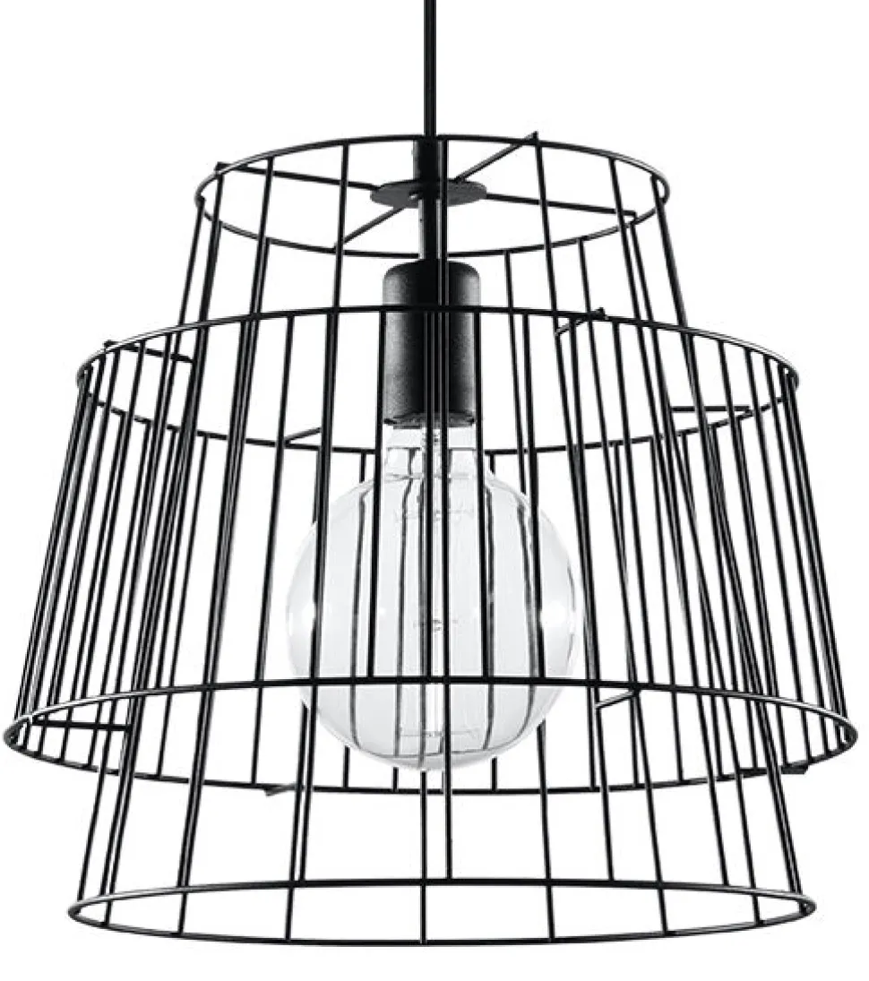 Der käfigartige Lampenschirm setzt das frei sichtbare Leuchtmittel besonders in Szene