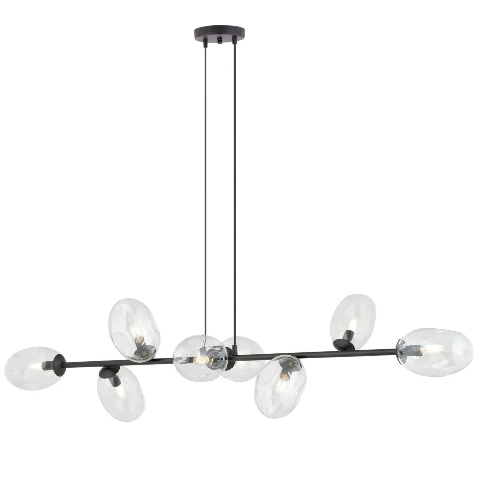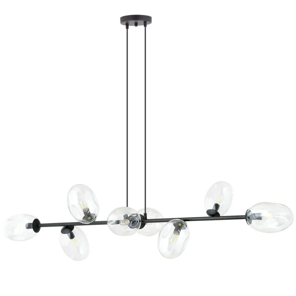 Die längliche Hängeleuchte sorgt für eine direkte Beleuchtung und passt ideal über den Esstisch