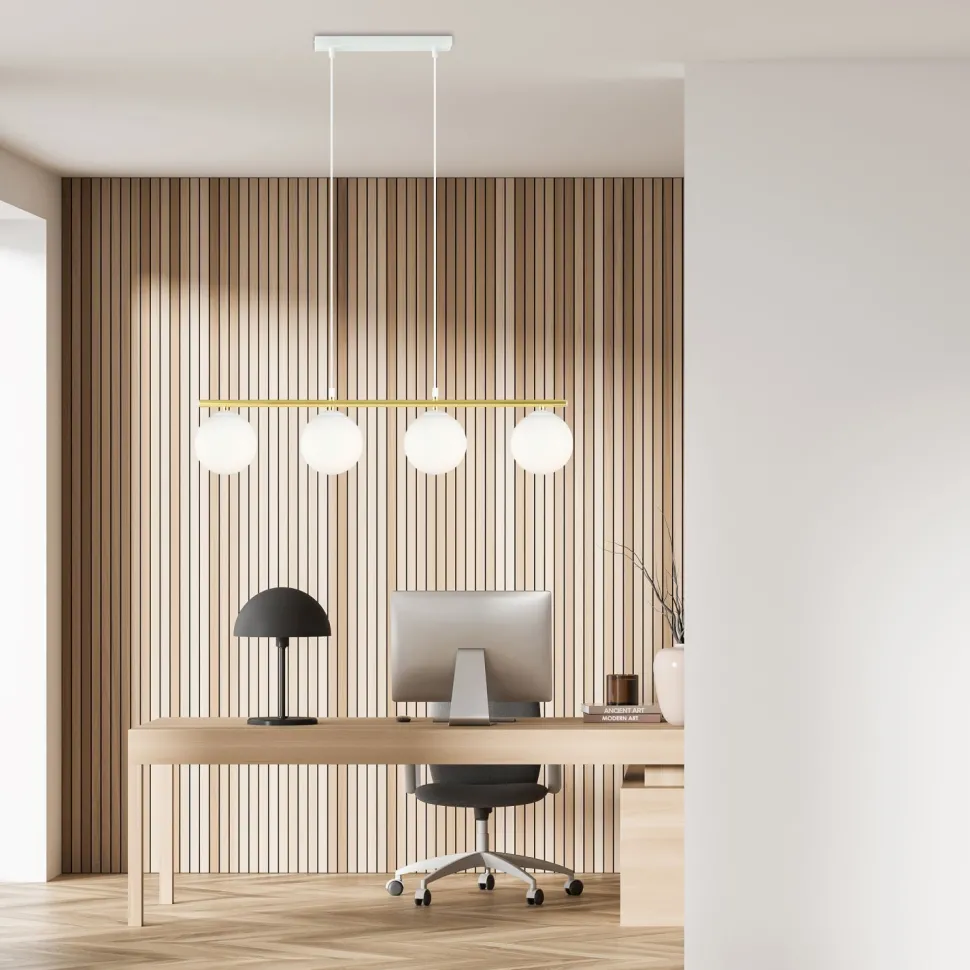 Die längliche Hängeleuchte sorgt für eine blendarme Beleuchtung und passt ideal über den Esstisch