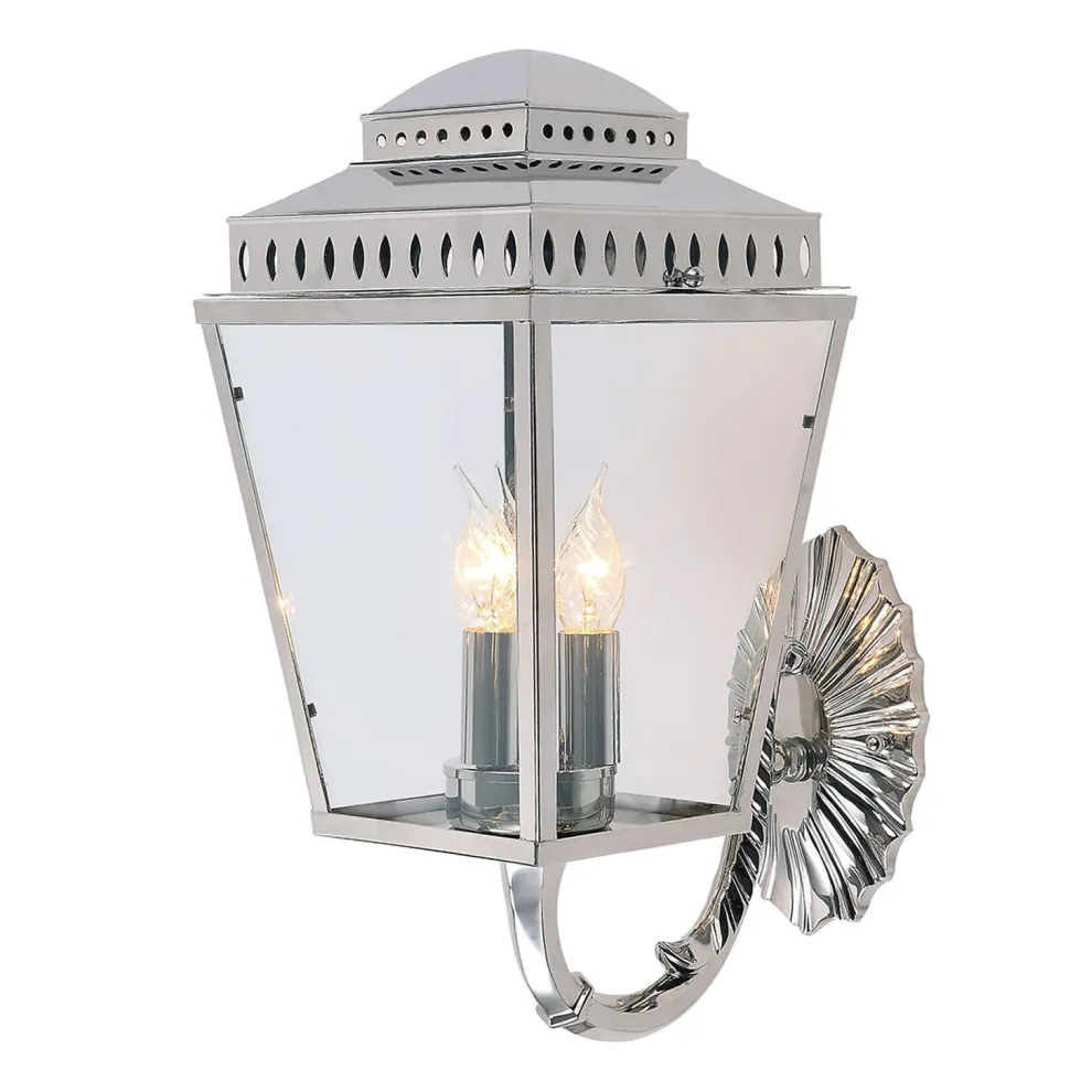 Die Wandlampe wurde in einem poliertem Nickel-Ton gehalten und setzt überall dekorative Akzente