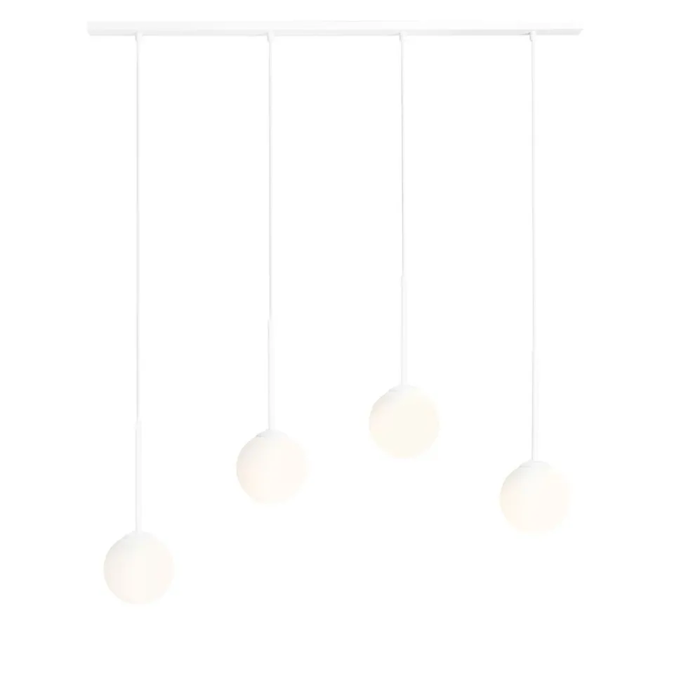 Die satinierten Kugelschirme aus Glas streuen das Licht warm und weich – ideal für ein gemütliches Ambiente über dem Esstisch in Wohnzimmer und Esszimmer
