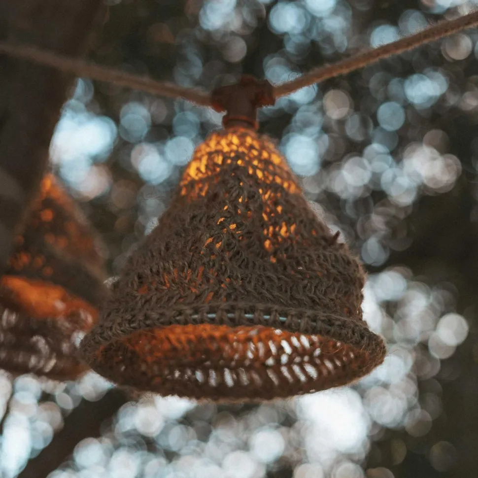 Multifunktionale Außenlichterkette mit dekorativen Lampenschirmen aus geflochtener Jute