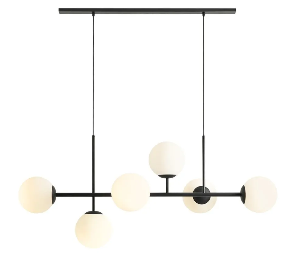 Die geweißten Glasschirme im Kugel Design sorgen für warmes und weiches Licht ohne Blenden – perfekt als Hängelampe über dem Esstisch in Esszimmer und Wohnzimmer