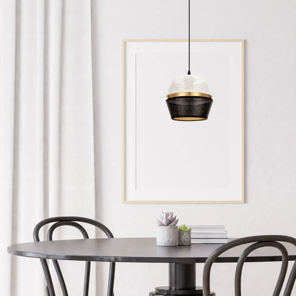 Qualität Made in EU Entdecke die Loft Pendelleuchte PATBOND – ein stilvolles Highlight für dein Zuhause! Mit ihrem eleganten Design in Schwarz, Weiß und Gold fügt sich diese Pendelleuchte harmonisch in jedes moderne Interieur ein. Ob über dem Esstisch, in der Küche oder im Wohnzimmer, die PATBOND sorgt für eine einladende Lichtstimmung und setzt gleichzeitig stilvolle Akzente. Die Pendelleuchte hat einen Durchmesser von 200 mm und eine Hängetiefe von 900 mm, was sie ideal für hohe Decken macht. Ihr einzigartiges Merkmal sind die winzigen Löcher im Metallschirm, die ein faszinierendes Lichterlebnis schaffen und für eine angenehme Atmosphäre sorgen. Mit einer maximalen Leistung von 60W und einem E27 Leuchtmittel kannst du die Lichtfarbe ganz nach deinen Wünschen wählen – perfekt für gemütliche Abende oder gesellige Zusammenkünfte. Die PATBOND ist nicht nur ein echter Blickfang, sondern auch äußerst funktional. Sie ist für den Innengebrauch (IP20) konzipiert und wird mit 230V betrieben. Die selbsttragende Aufhängung sorgt für eine einfache Installation und Stabilität. Qualität Made in EU garantiert dir Langlebigkeit und Zuverlässigkeit. Egal, ob du nach einer stilvollen Esstischlampe, einer modernen Küchenlampe oder einer eleganten Wohnzimmerlampe suchst – die Loft Pendelleuchte PATBOND erfüllt all deine Anforderungen. Lass dich von ihrem Design inspirieren und schaffe eine harmonische Atmosphäre in deinem Zuhause! Fazit: Die Loft Pendelleuchte PATBOND vereint Funktionalität und Ästhetik auf perfekte Weise. Hol dir dieses Schmuckstück und erlebe, wie es dein Zuhause in ein stilvolles Licht taucht!