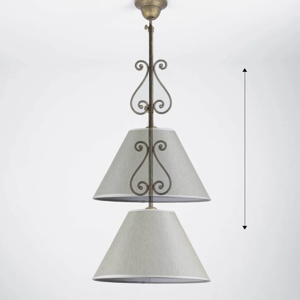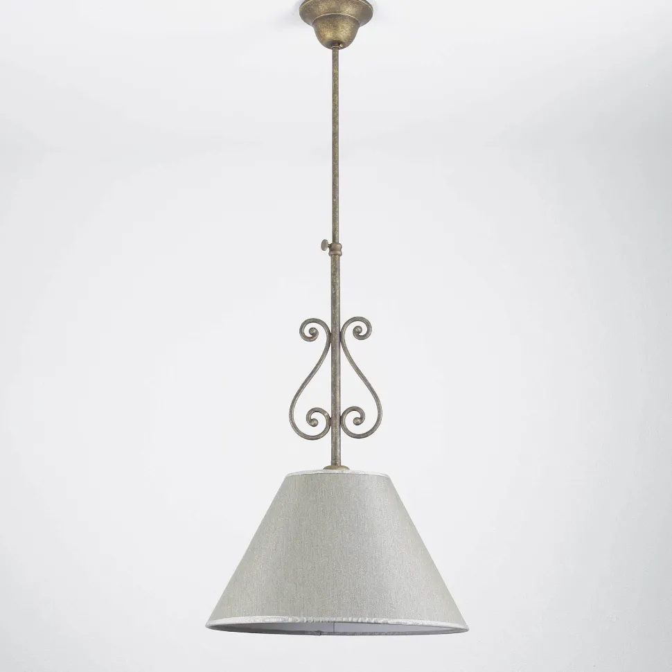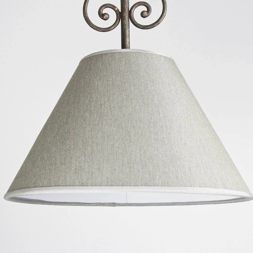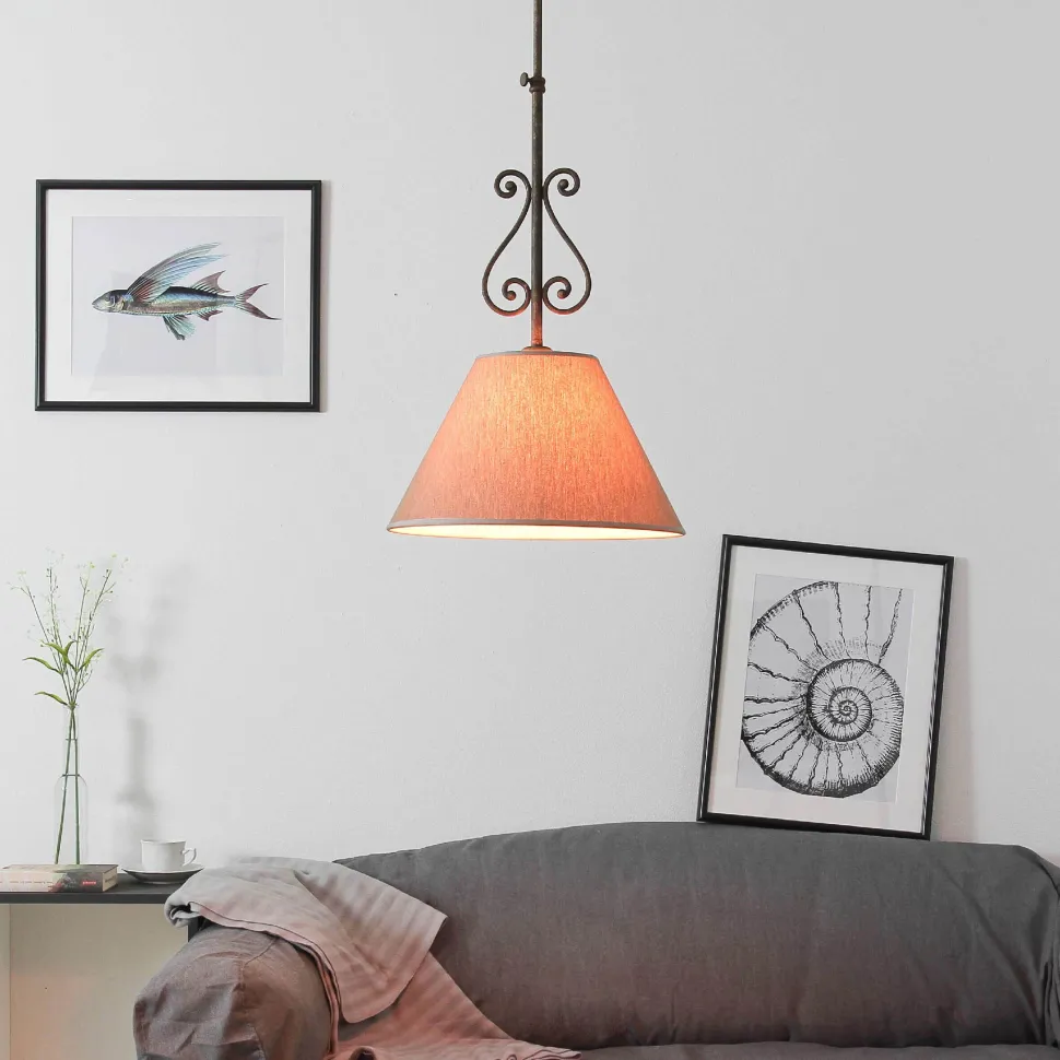 Rustikale Deckenlampe mit urig geschwungener Form und grob gewebtem Stoffschirm