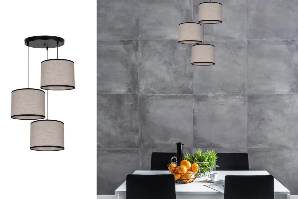 Qualität Made in EU Entdecke die moderne Pendelleuchte LADIUN – ein stilvolles Highlight für dein Zuhause! Mit ihrem eleganten Design aus schwarzem Metall und beigem Stoff fügt sich diese Leuchte harmonisch in jedes Wohnambiente ein. Ob über dem Esstisch oder im Wohnzimmer, die LADIUN sorgt für eine einladende Lichtstimmung, die zum Verweilen einlädt. Die Pendelleuchte hat eine großzügige Länge von 900 mm und eine Höhe von 450 mm, wodurch sie sowohl für hohe als auch für niedrige Decken geeignet ist. Die blendarmen Stoffschirme streuen das Licht sanft und gleichmäßig, ideal für gemütliche Abende mit Freunden oder der Familie. Dank der Verwendung von 3x E27 Leuchtmitteln (max. 60W) kannst du die Lichtintensität ganz nach deinen Wünschen anpassen. Mit einem IP-Schutz von IP20 ist die LADIUN perfekt für den Innenbereich geeignet und wird mit einer Spannung von 230V betrieben. Die selbsttragende Kabelaufhängung sorgt für eine einfache Installation und verleiht der Leuchte einen modernen Touch. Qualität Made in EU garantiert dir zudem Langlebigkeit und Zuverlässigkeit. Egal, ob du auf der Suche nach einer stilvollen Esstischlampe oder einer eleganten Wohnzimmerlampe bist, die Pendelleuchte LADIUN erfüllt all deine Anforderungen. Sie vereint Funktionalität und Design und ist die perfekte Wahl für alle, die Wert auf Qualität und Ästhetik legen. Lass dich von der LADIUN inspirieren und bringe frischen Wind in dein Zuhause!